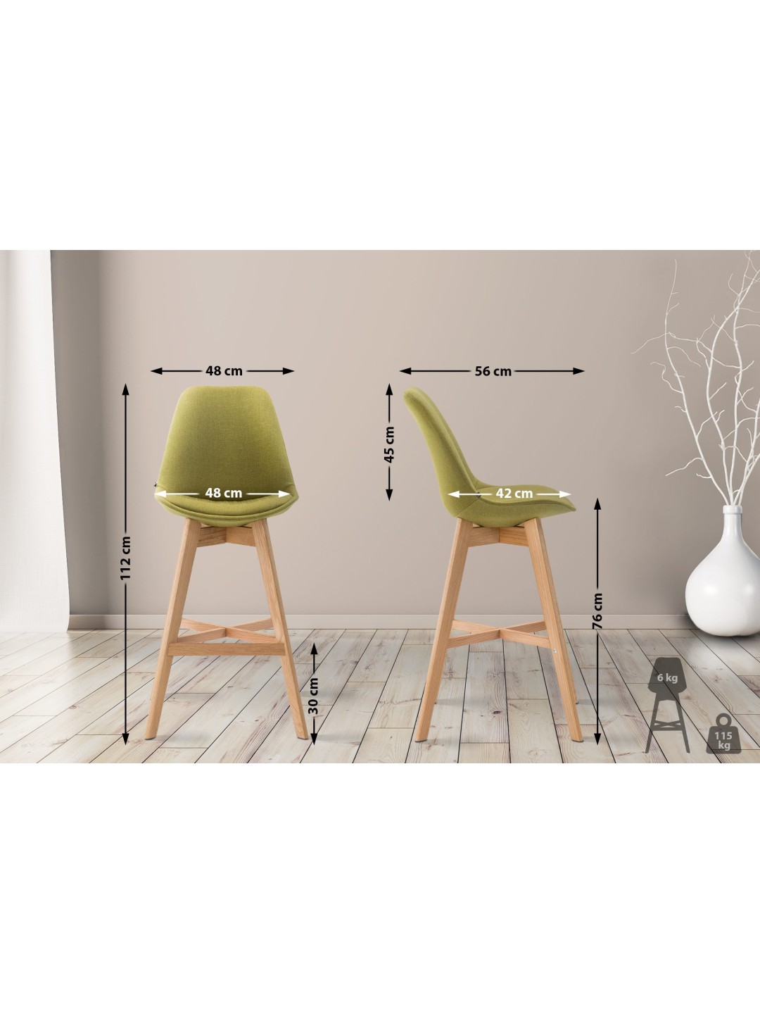 La estructura está hecha de roble, que es ideal para la construcción de muebles debido a su estabilidad. Las patas del taburete se estabilizan mediante travesaños sobre los que se pueden colocar los pies para relajarse. Para que los suelos delicados no se rayen, las cuatro patas de la silla tienen protectores de suelo de plástico.