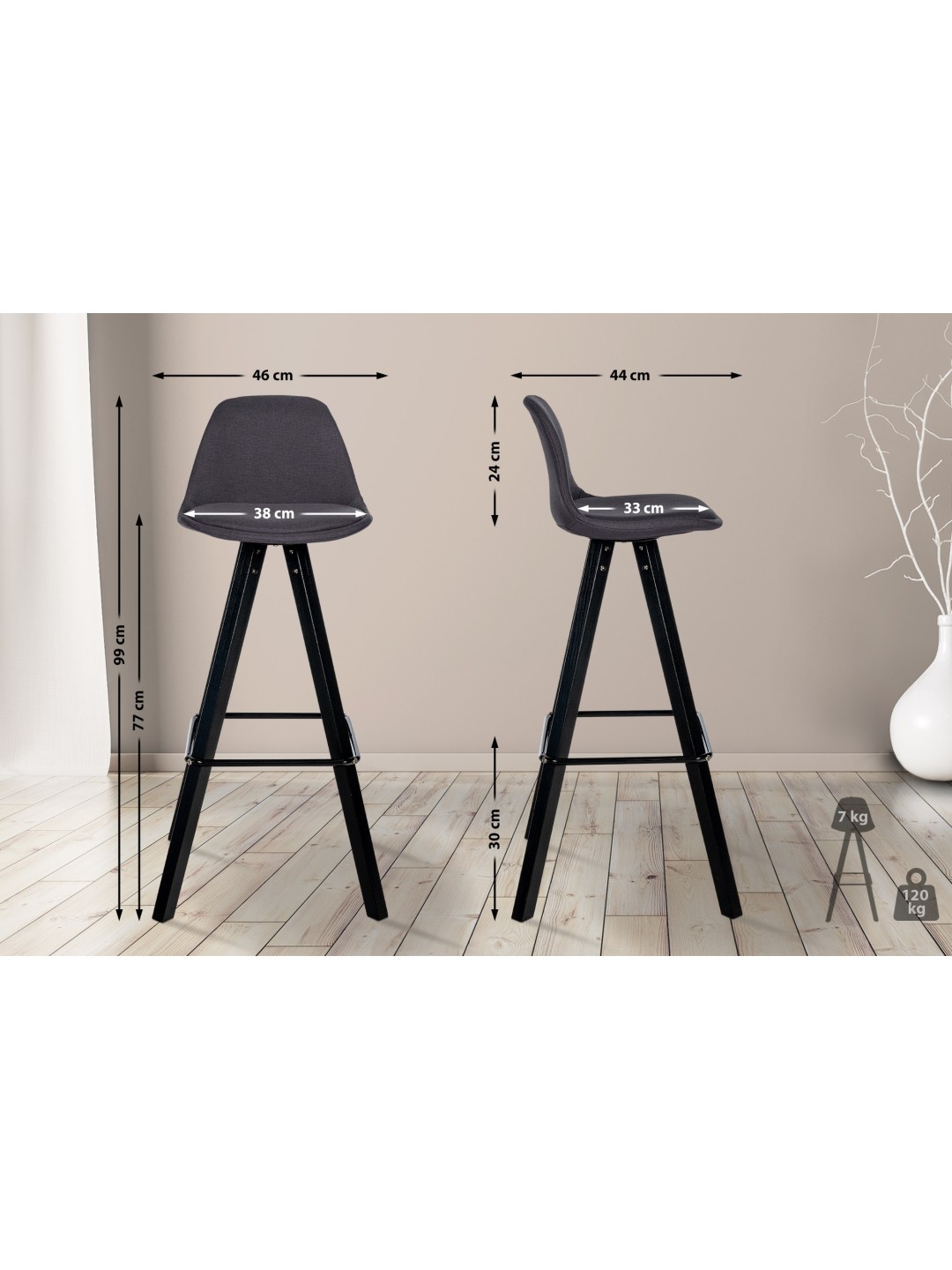El taburete de bar convence por su diseño moderno y su sólida estructura de madera, que garantiza una capacidad de carga de hasta 120 kg. El asiento acolchado fabricado con tela de alta calidad garantiza una comodidad duradera, mientras que el respaldo y el reposapiés integrado brindan apoyo y comodidad adicionales.