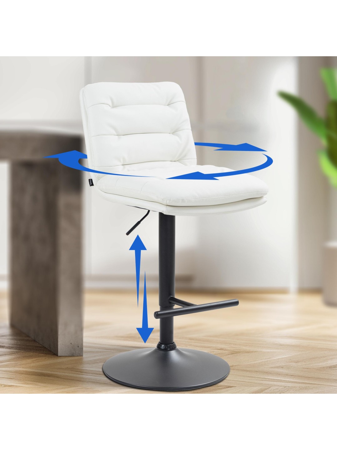 La estructura del taburete y la moderna funda le dan al taburete una apariencia elegante. El asiento está tapizado con cuero artificial de fácil cuidado. La estructura de metal es ajustable en altura y la función de rotación de 360 grados garantiza una gran libertad de movimiento.