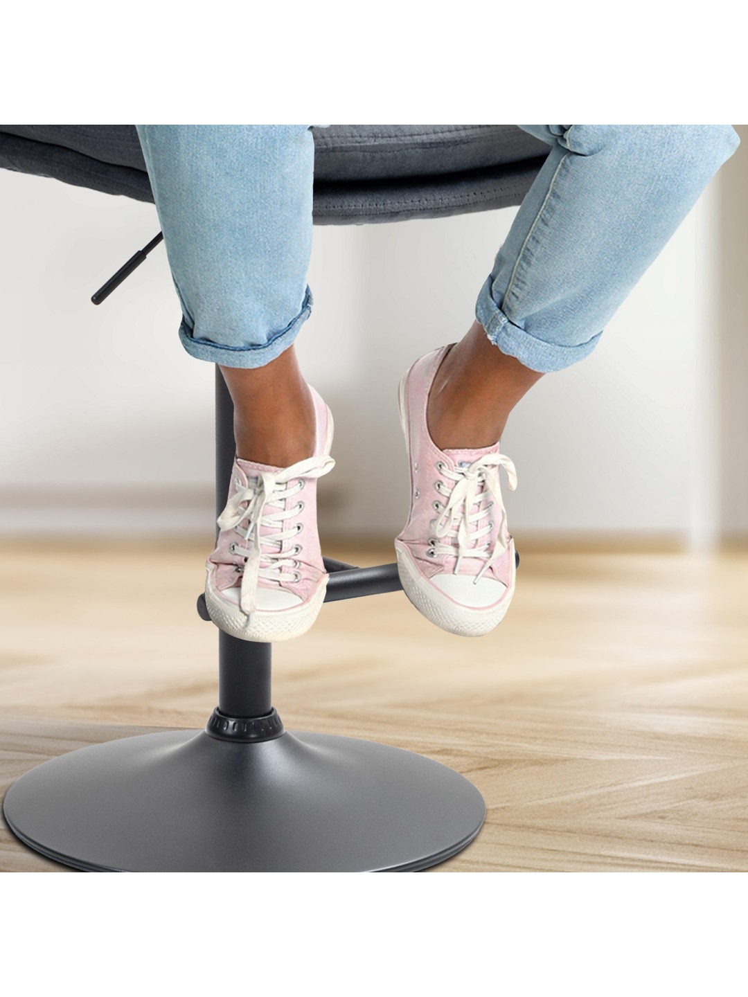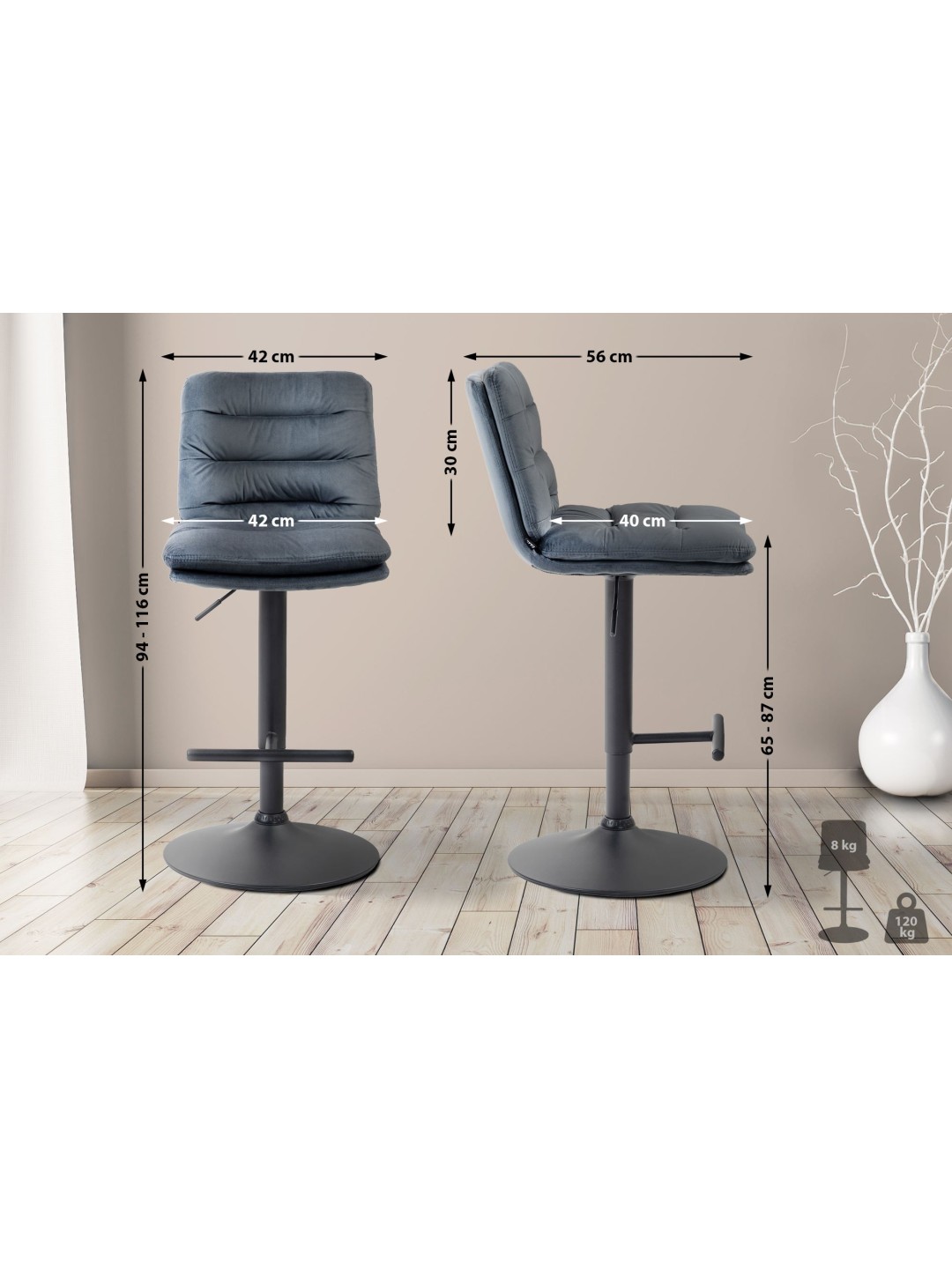 La estructura del taburete y la moderna funda le dan al taburete una apariencia elegante. El asiento está tapizado en elegante terciopelo. La estructura de metal es ajustable en altura y la función de rotación de 360 grados garantiza una gran libertad de movimiento.
