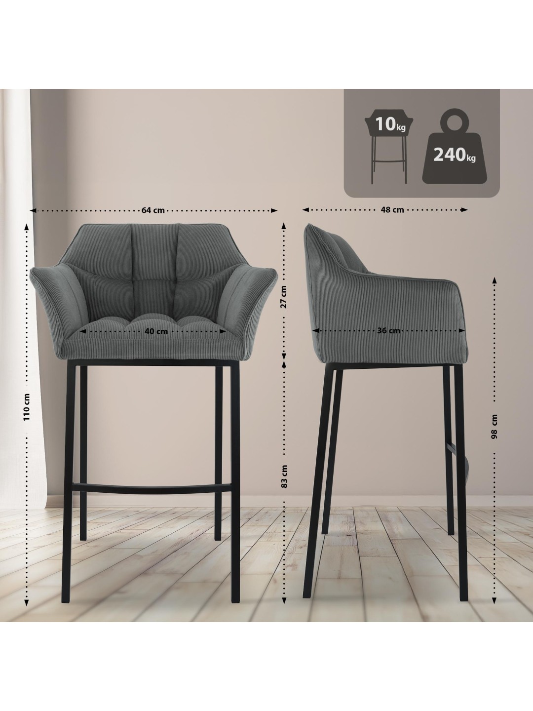 El taburete debe su hermosa apariencia a la elegante combinación de la elegante funda de pana y la estructura de metal de cuatro patas.