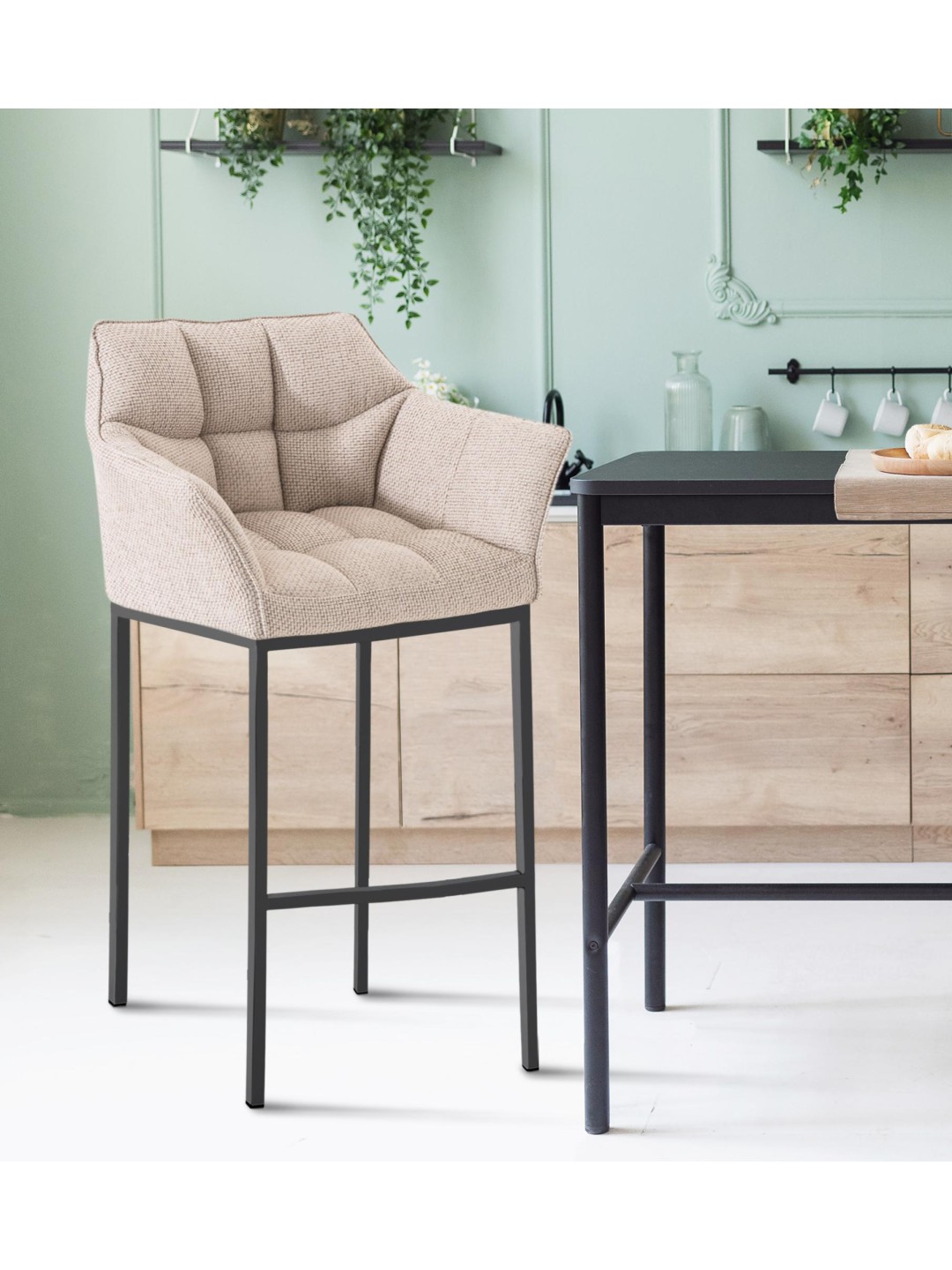 El taburete debe su hermoso aspecto a la elegante combinación de una moderna funda de tela y la estructura de metal de cuatro patas.