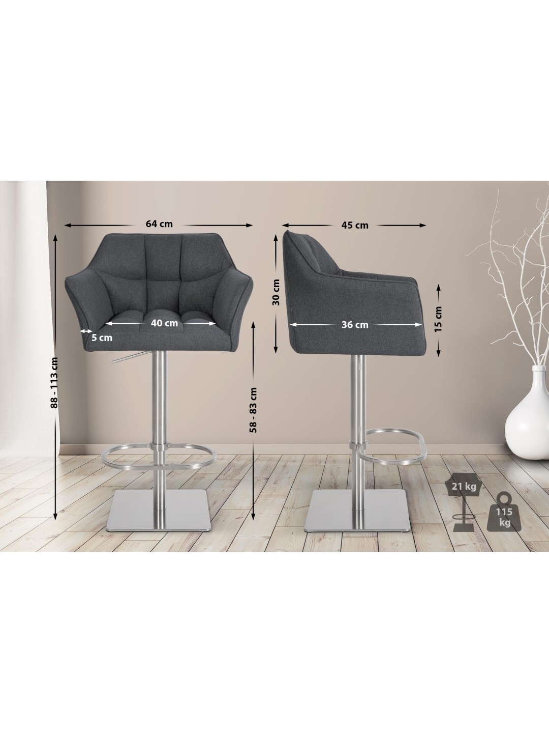 La estructura de acero inoxidable soporta hasta 150 kilogramos y le da al taburete un toque moderno. La silla de mostrador Damaso es el complemento perfecto para bares, encimeras de cocina o salones y ofrece el máximo placer de sentarse en un diseño elegante.