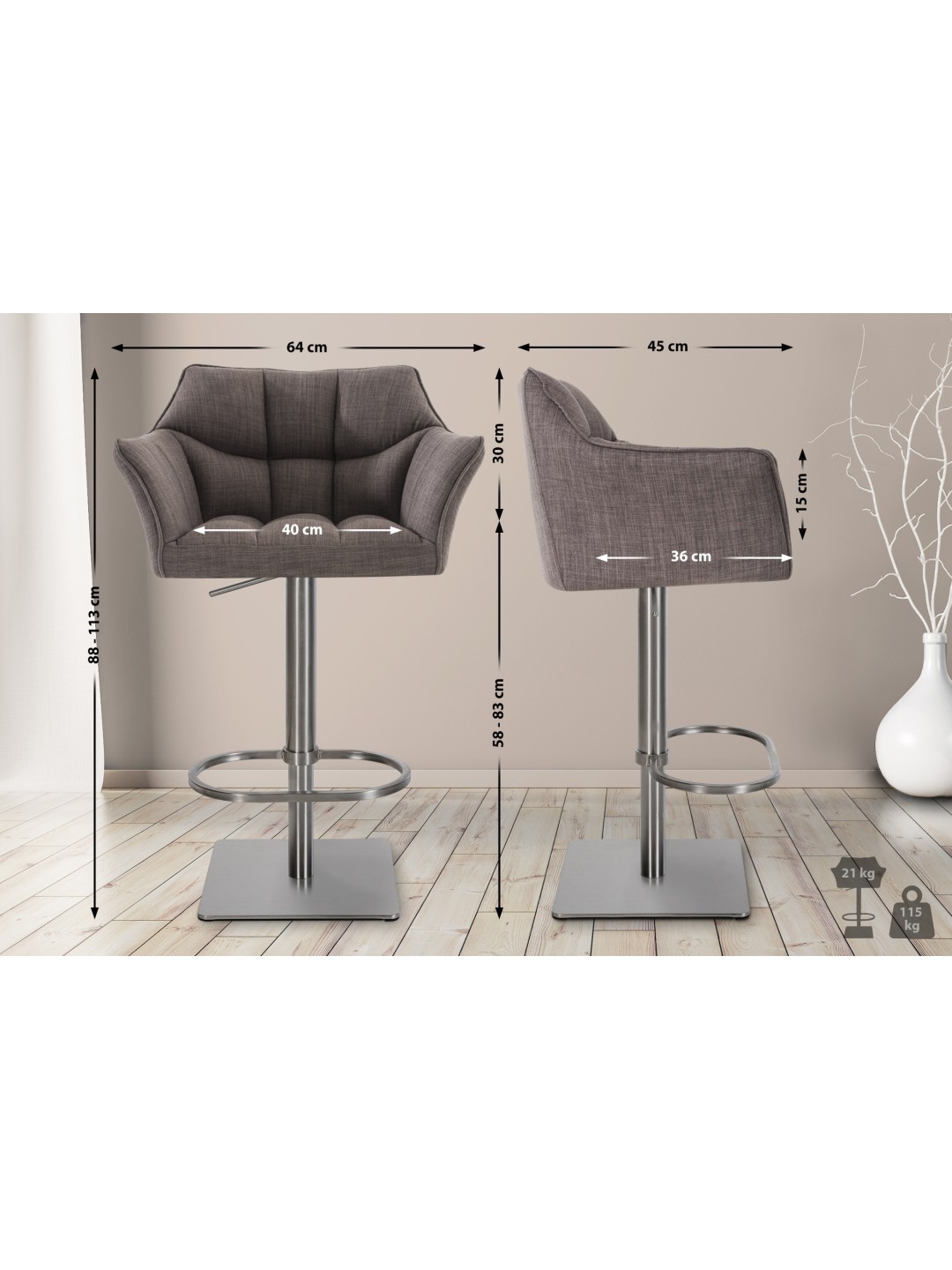 El respaldo y los reposabrazos proporcionan comodidad adicional al sentarse y una postura relajada. El taburete de bar es regulable en altura, de modo que la altura del asiento se puede ajustar entre 58 y 83 cm. La función de rotación de 360 grados permite un movimiento sin esfuerzo. Gracias al reposapiés integrado, las patas se pueden aliviar.
