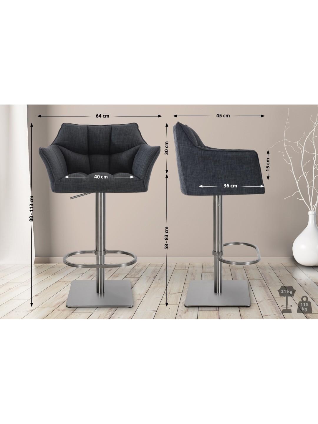 El respaldo y los reposabrazos proporcionan comodidad adicional al sentarse y una postura relajada. El taburete de bar es regulable en altura, de modo que la altura del asiento se puede ajustar entre 58 y 83 cm. La función de rotación de 360 grados permite un movimiento sin esfuerzo. Gracias al reposapiés integrado, las patas se pueden aliviar.