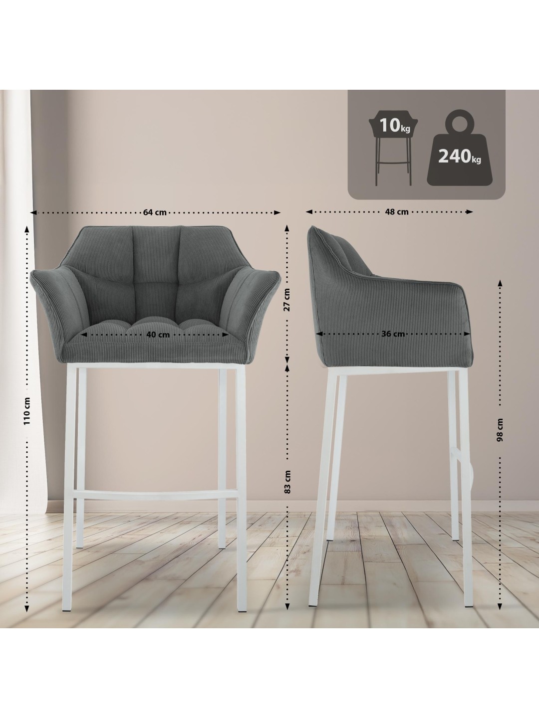 El taburete debe su hermosa apariencia a la elegante combinación de la elegante funda de pana y la estructura de metal de cuatro patas.