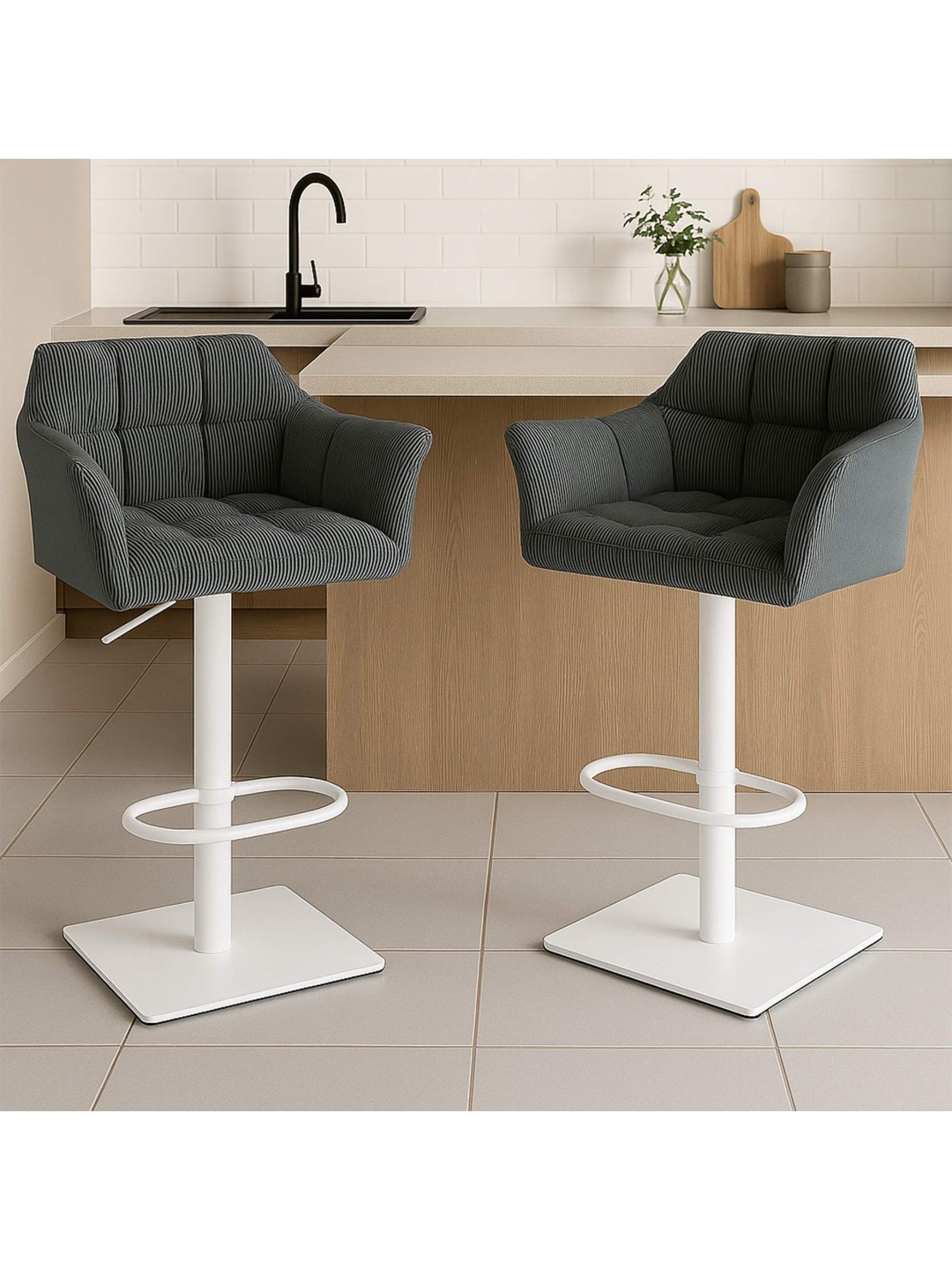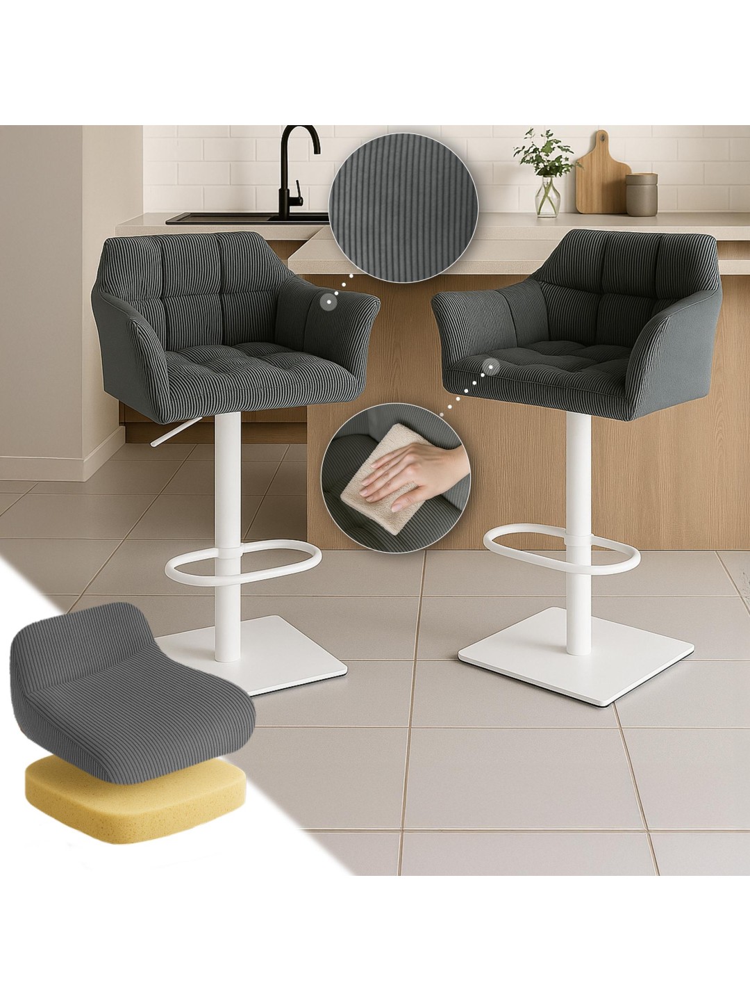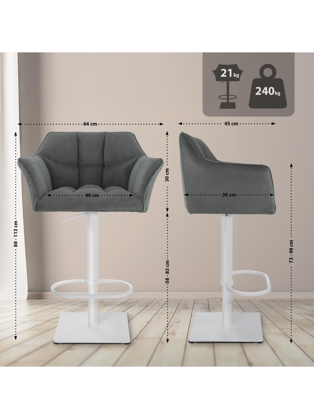 Con una impresionante capacidad de carga de 240 kg, el taburete no sólo ofrece estabilidad, sino también un excelente confort. El ajuste de altura integrado permite una adaptación flexible a diferentes alturas de mesa, lo que la hace especialmente versátil.