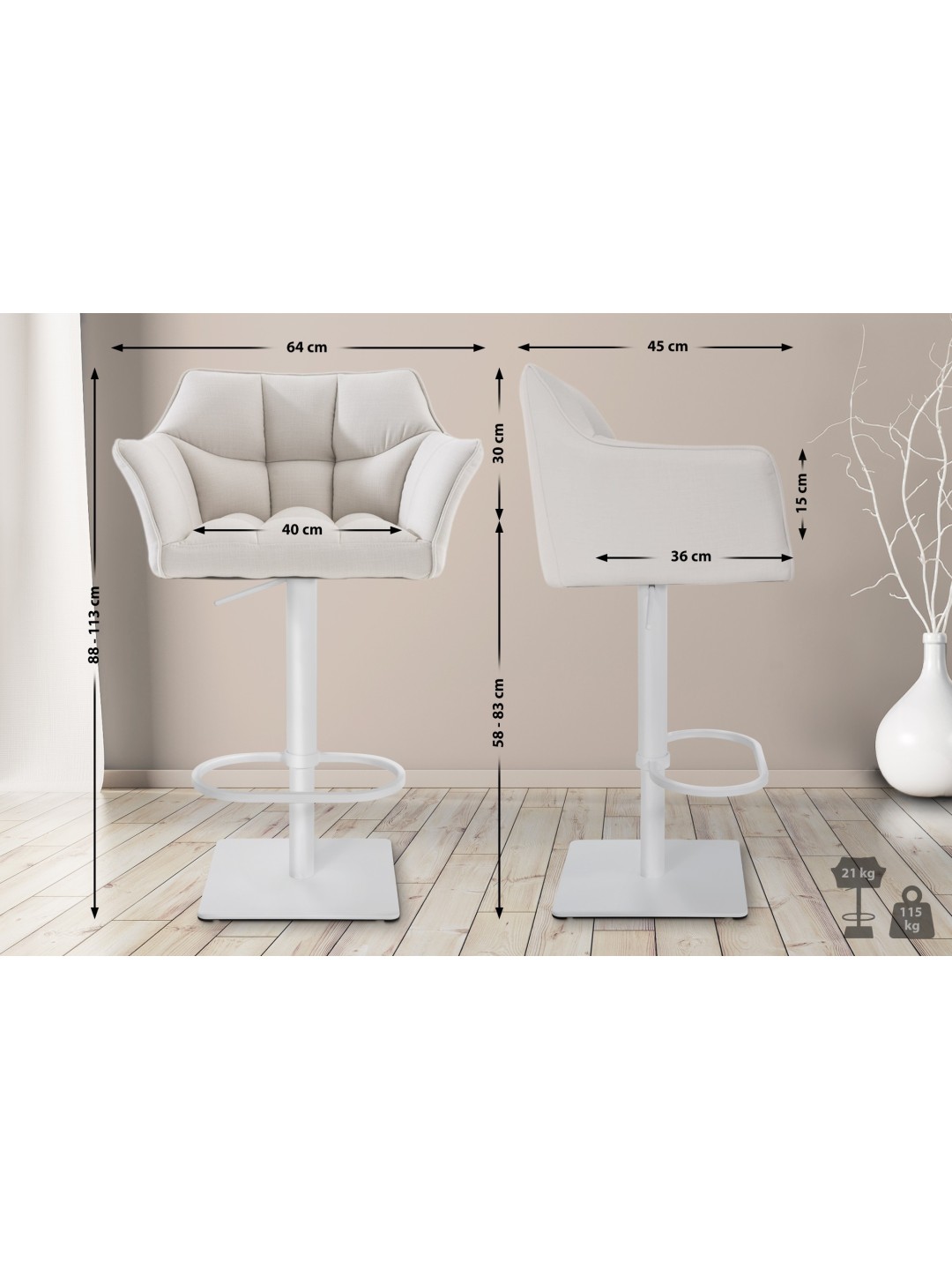 El respaldo y los reposabrazos proporcionan comodidad adicional al sentarse y una postura relajada. El taburete de bar es regulable en altura, de modo que la altura del asiento se puede ajustar entre 58 y 83 cm. La función de rotación de 360 ​​grados permite un movimiento sin esfuerzo. Gracias al reposapiés integrado, las patas se pueden aliviar.