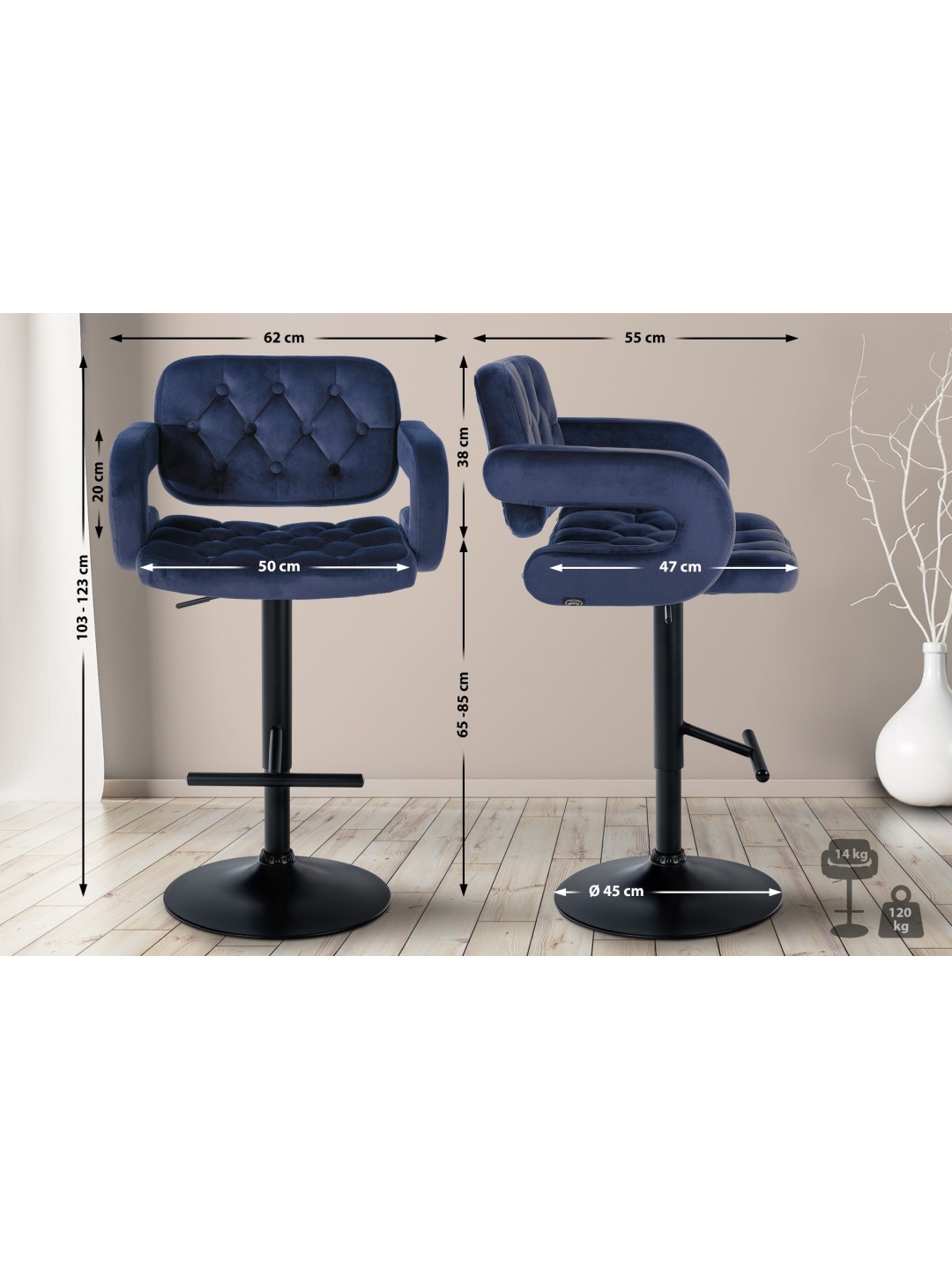 La silla de bar es regulable en altura, de modo que la altura del asiento se puede ajustar entre 65 y 85 cm. Esto significa que el taburete se puede utilizar de diversas formas en diferentes alturas de mesa o mostrador.