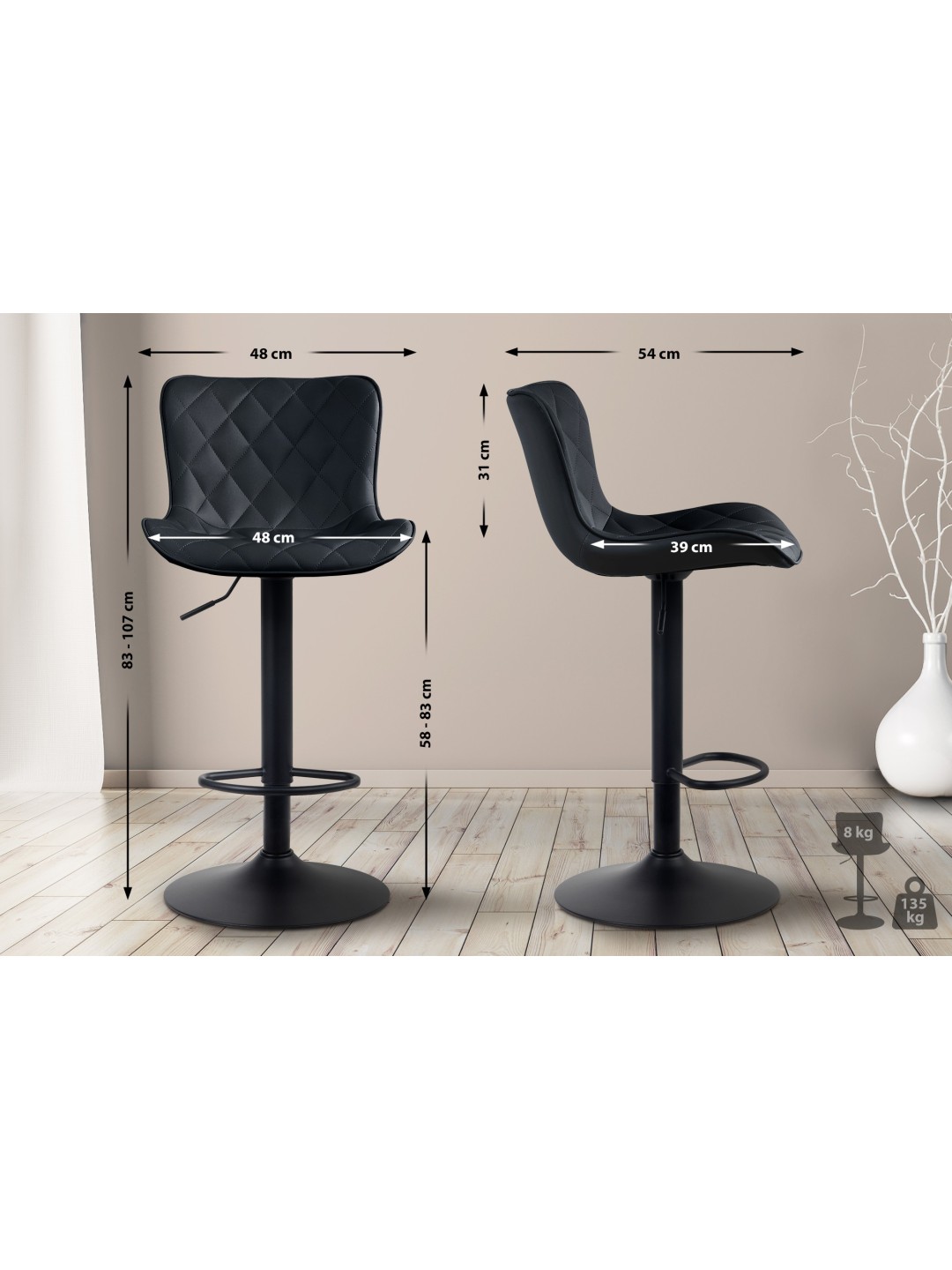 La base en forma de trompeta permite que el asiento gire 360°. El taburete para mostrador también es ajustable en altura y ofrece un soporte seguro gracias a su base estable.