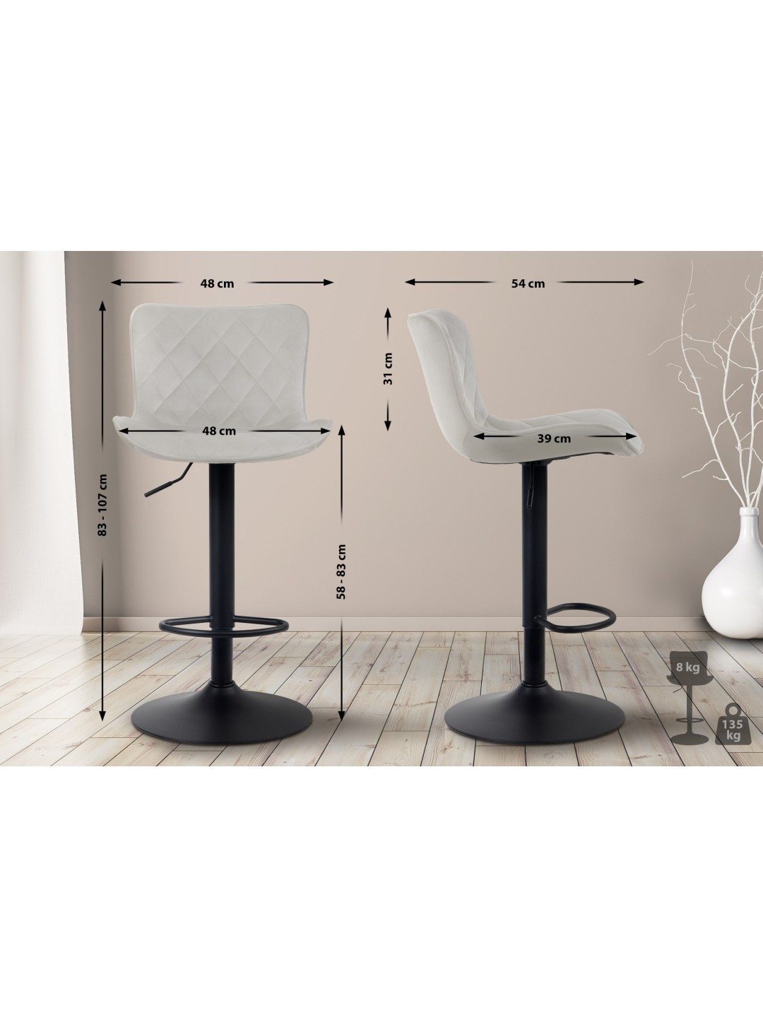 La base en forma de trompeta permite que el asiento gire 360°. El taburete para mostrador también es ajustable en altura y ofrece un soporte seguro gracias a su base estable.