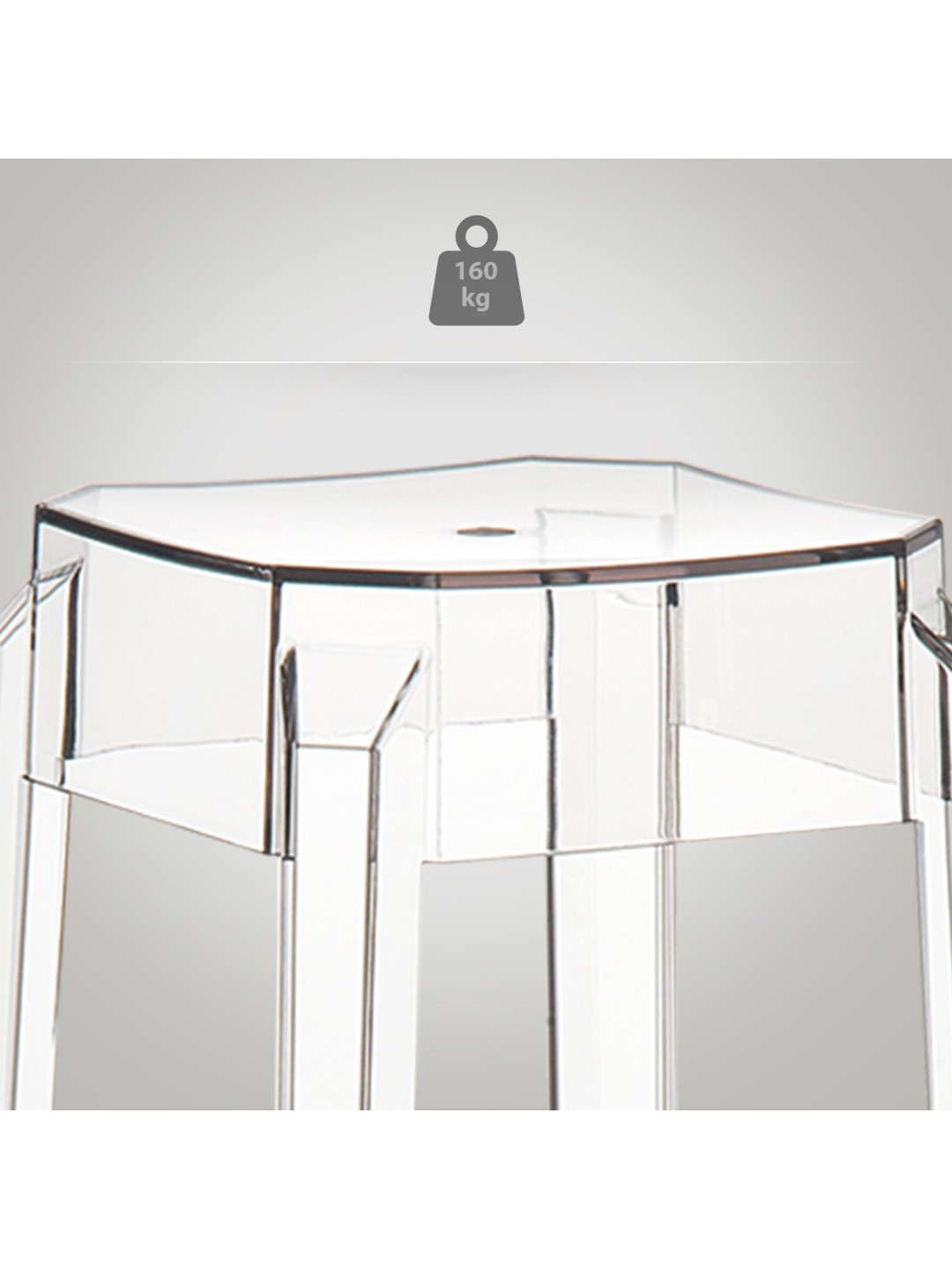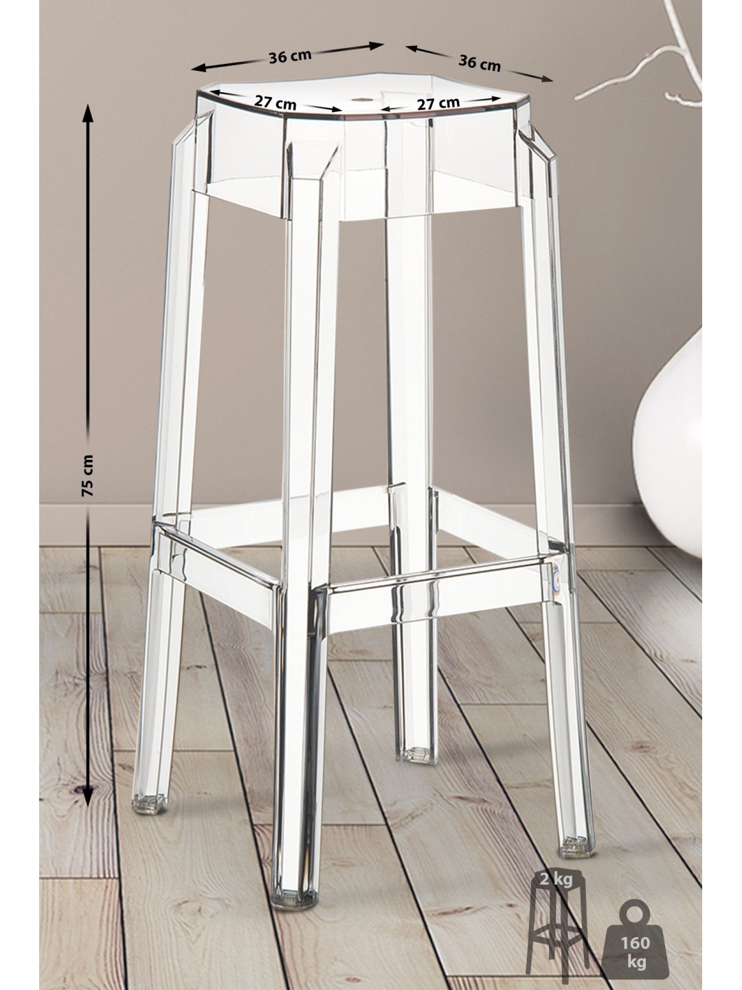 Con una altura de asiento de 75 cm y un reposapiés circundante, ofrece una comodidad especial. El taburete del mostrador es apilable para poder guardarlo y ahorrar espacio. El taburete está hecho de nailon brillante de alta calidad o de policarbonato transparente.
