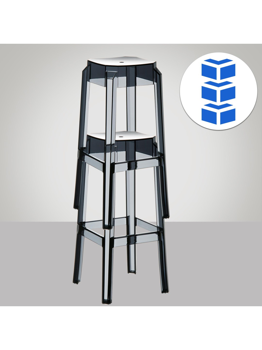 Con una altura de asiento de 75 cm y un reposapiés circundante, ofrece una comodidad especial. El taburete del mostrador es apilable para poder guardarlo y ahorrar espacio. El taburete está hecho de nailon brillante de alta calidad o de policarbonato transparente.