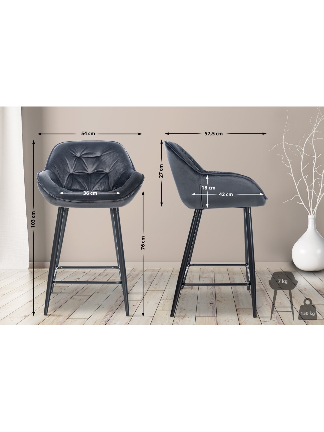 La robusta estructura de metal de cuatro patas garantiza que la silla se mantenga firme. El taburete de bar soporta hasta 150 kg de forma segura. Gracias a los protectores de suelo debajo de las patas de la silla, los suelos sensibles no se dañan.