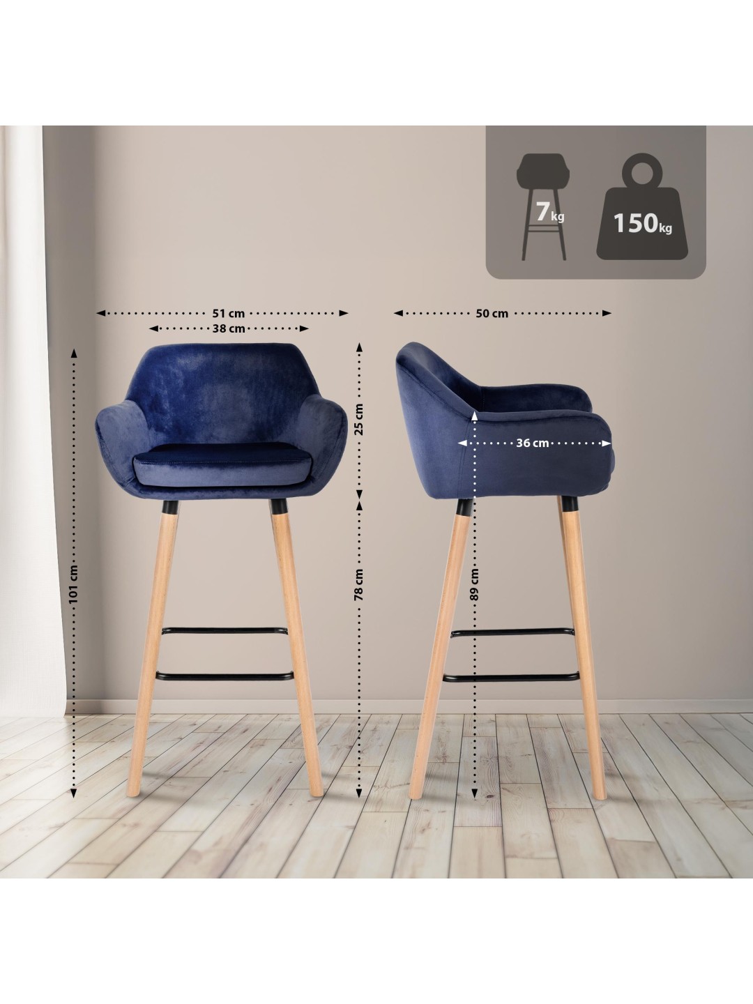 Taburete de bar Grant terciopelo, azul oscuro