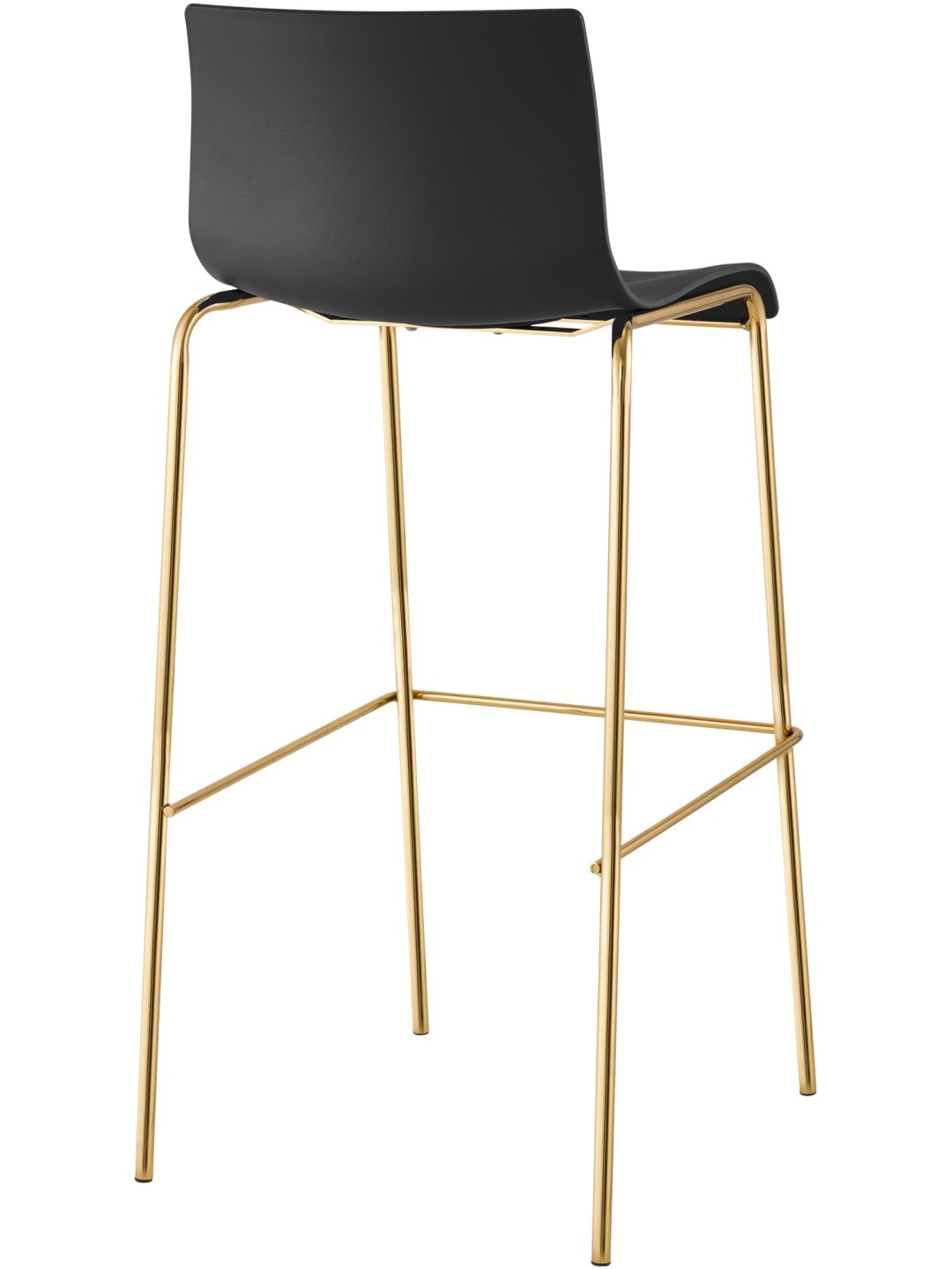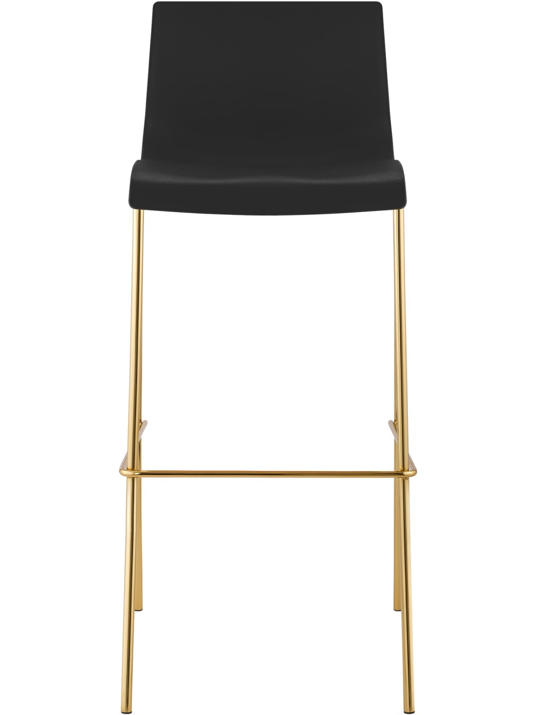 La carcasa del asiento y el respaldo garantizan un asiento cómodo y alivian la tensión en la zona lumbar. Un reposapiés integrado ofrece comodidad adicional. El taburete debe su hermoso aspecto en particular a la estructura de metal con aspecto dorado.