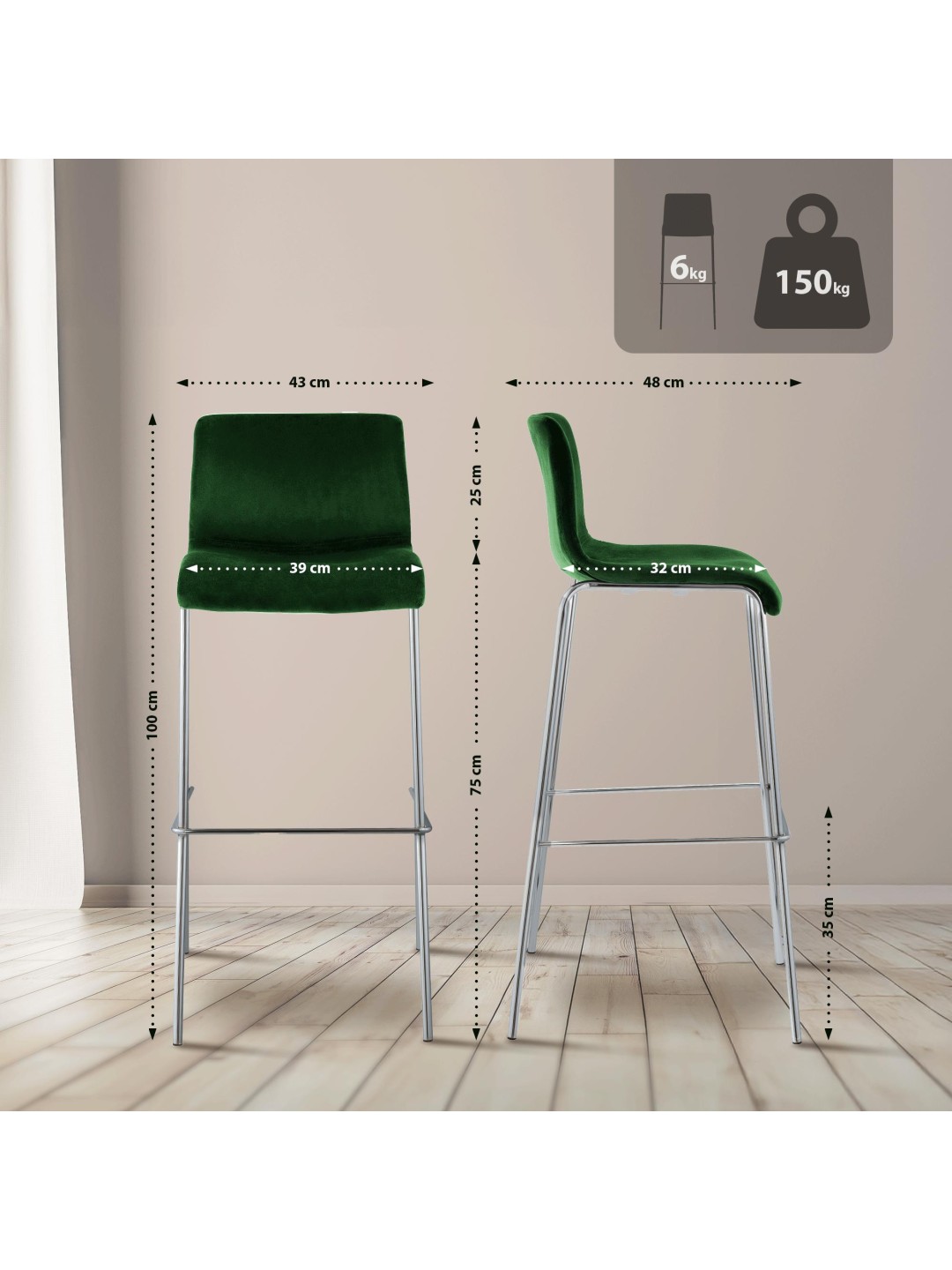 Taburete de bar Hoover terciopelo 4 pies cromo, verde