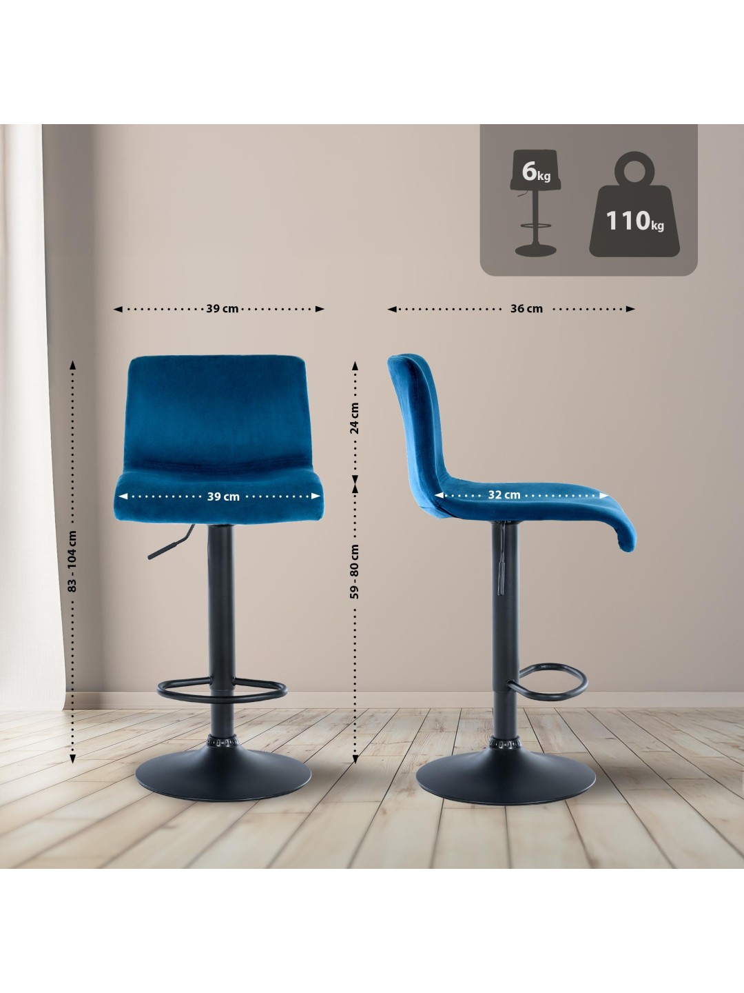 La carcasa del asiento y el respaldo suavemente acolchados garantizan un asiento cómodo y alivian la tensión en la zona lumbar. Un reposapiés integrado proporciona comodidad adicional al proporcionar un lugar relajante para que descansen los pies. Además de la altura del asiento ajustable, el taburete de bar se puede girar 360°.