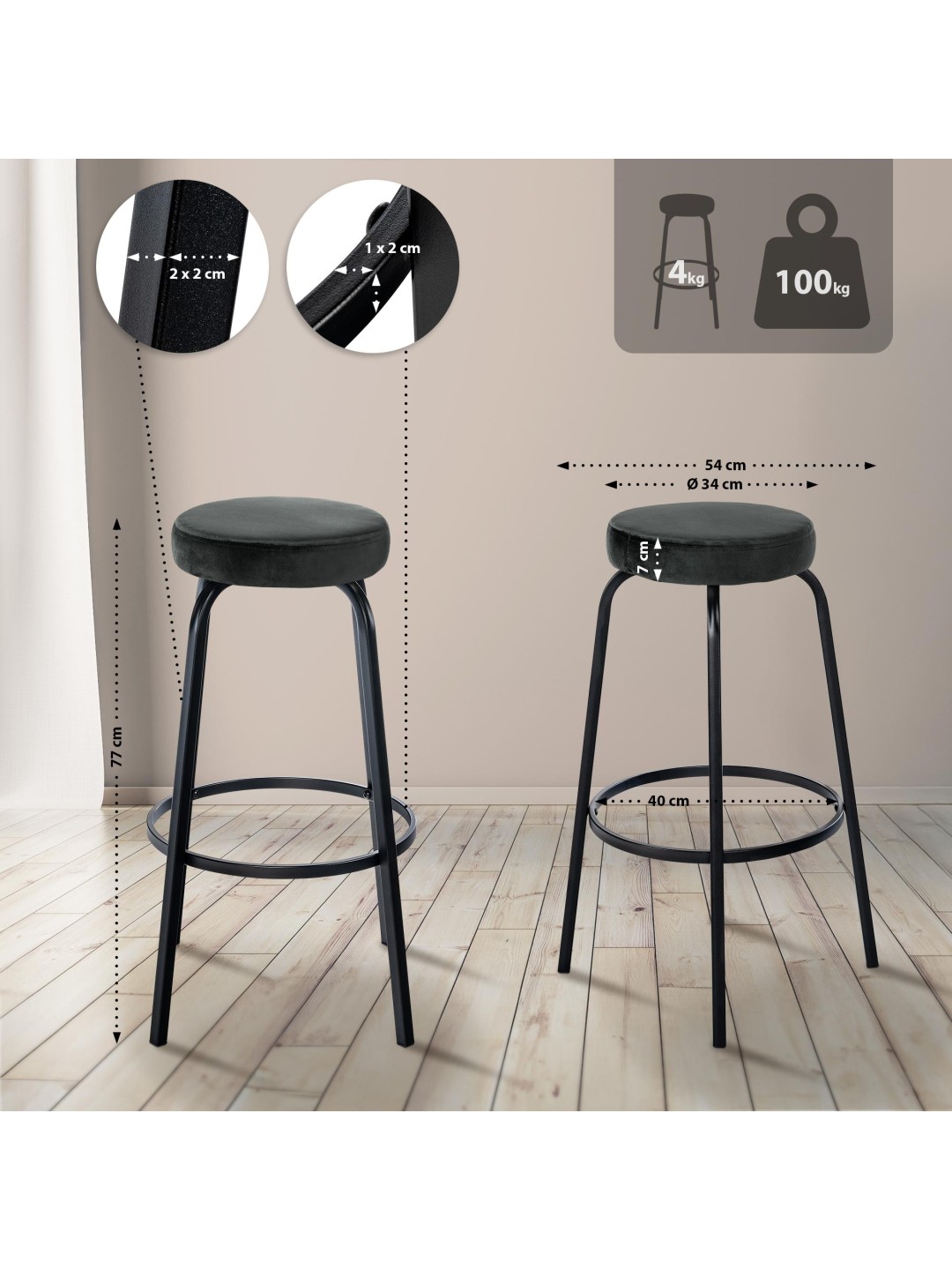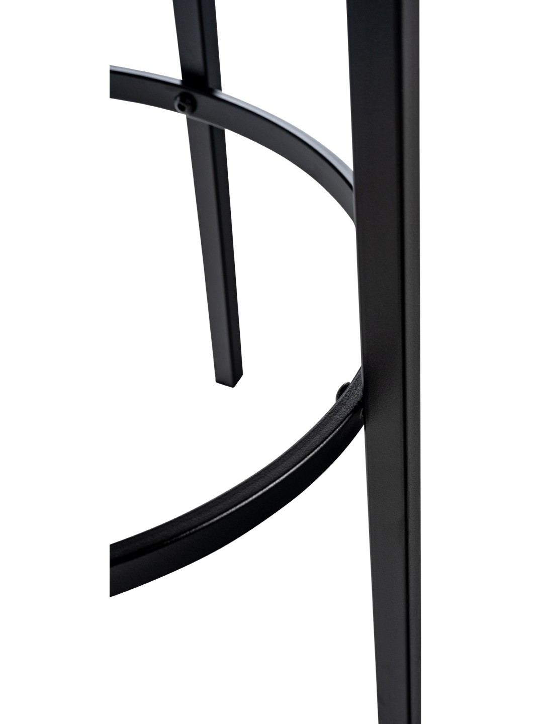 El taburete se apoya en una estructura de cuatro patas de metal negro mate. Este marco es estable y extremadamente cuidadoso con el suelo, por lo que no daña los suelos sensibles. Los travesaños del marco se pueden utilizar como cómodo reposapiés.