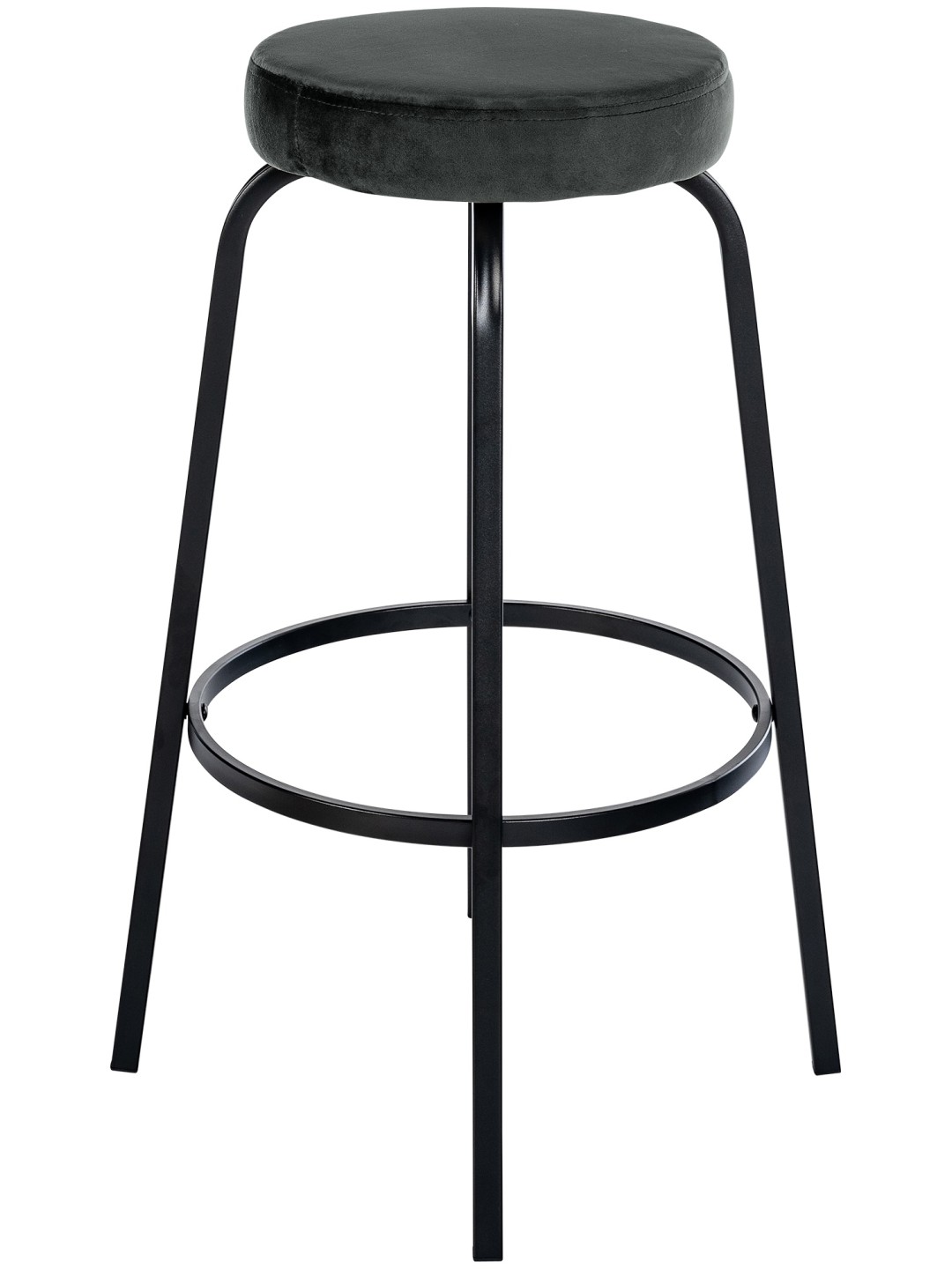 El taburete de bar Kamari impresiona por su combinación atemporal de asiento tapizado redondo y estructura de metal de cuatro patas en negro mate.