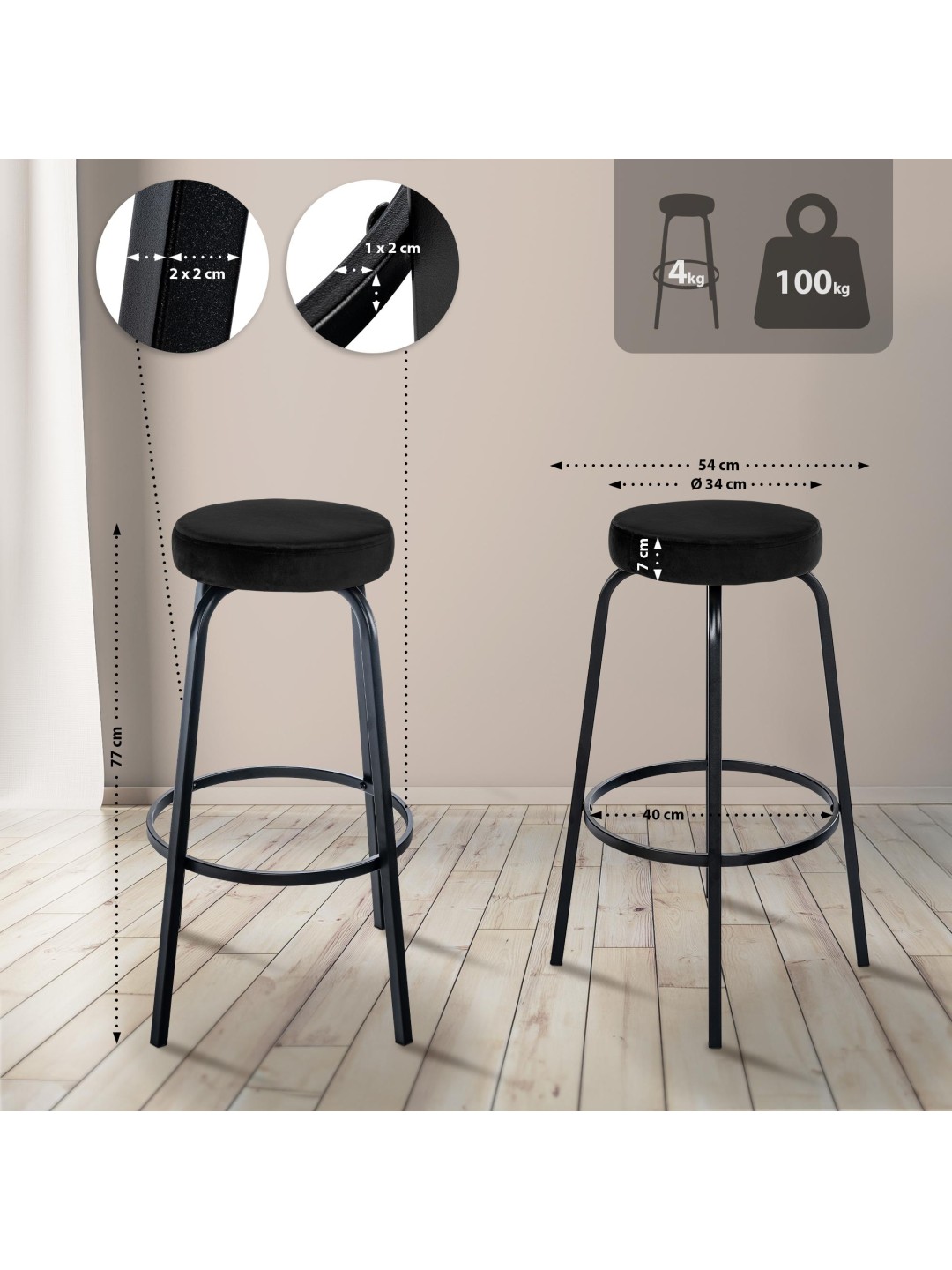 El taburete se apoya en una estructura de cuatro patas de metal negro mate. Este marco es estable y extremadamente cuidadoso con el suelo, por lo que no daña los suelos sensibles. Los travesaños del marco se pueden utilizar como cómodo reposapiés.
