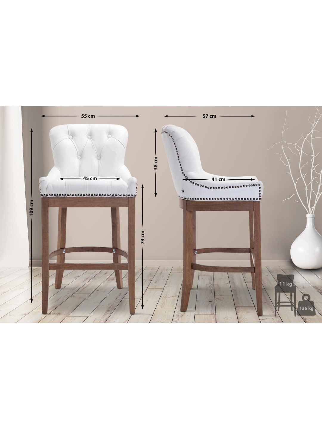 El taburete de bar Lakewood combina un asiento cómodo con un aspecto elegante. Llama especialmente la atención su tapizado de cuero auténtico, junto con el patrón acolchado y los botones decorativos.