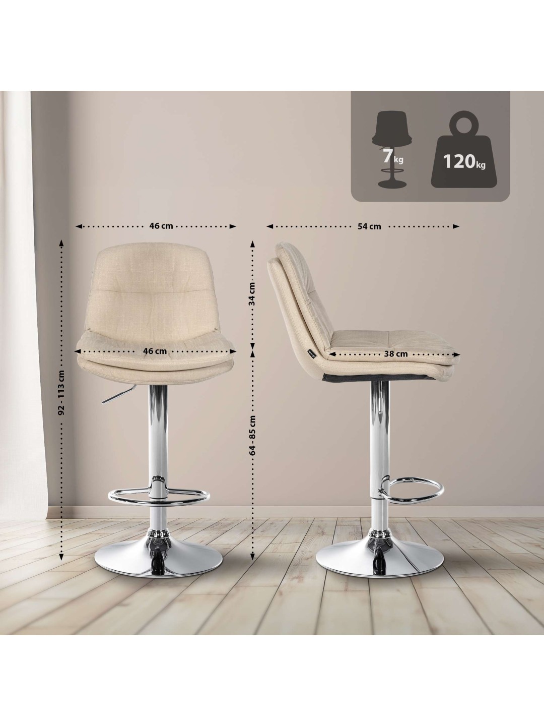 La estructura del taburete y la moderna funda le dan al taburete una apariencia elegante. El asiento está tapizado con tela duradera y de alta calidad. La estructura de metal es ajustable en altura y la función de rotación de 360 grados garantiza una gran libertad de movimiento.