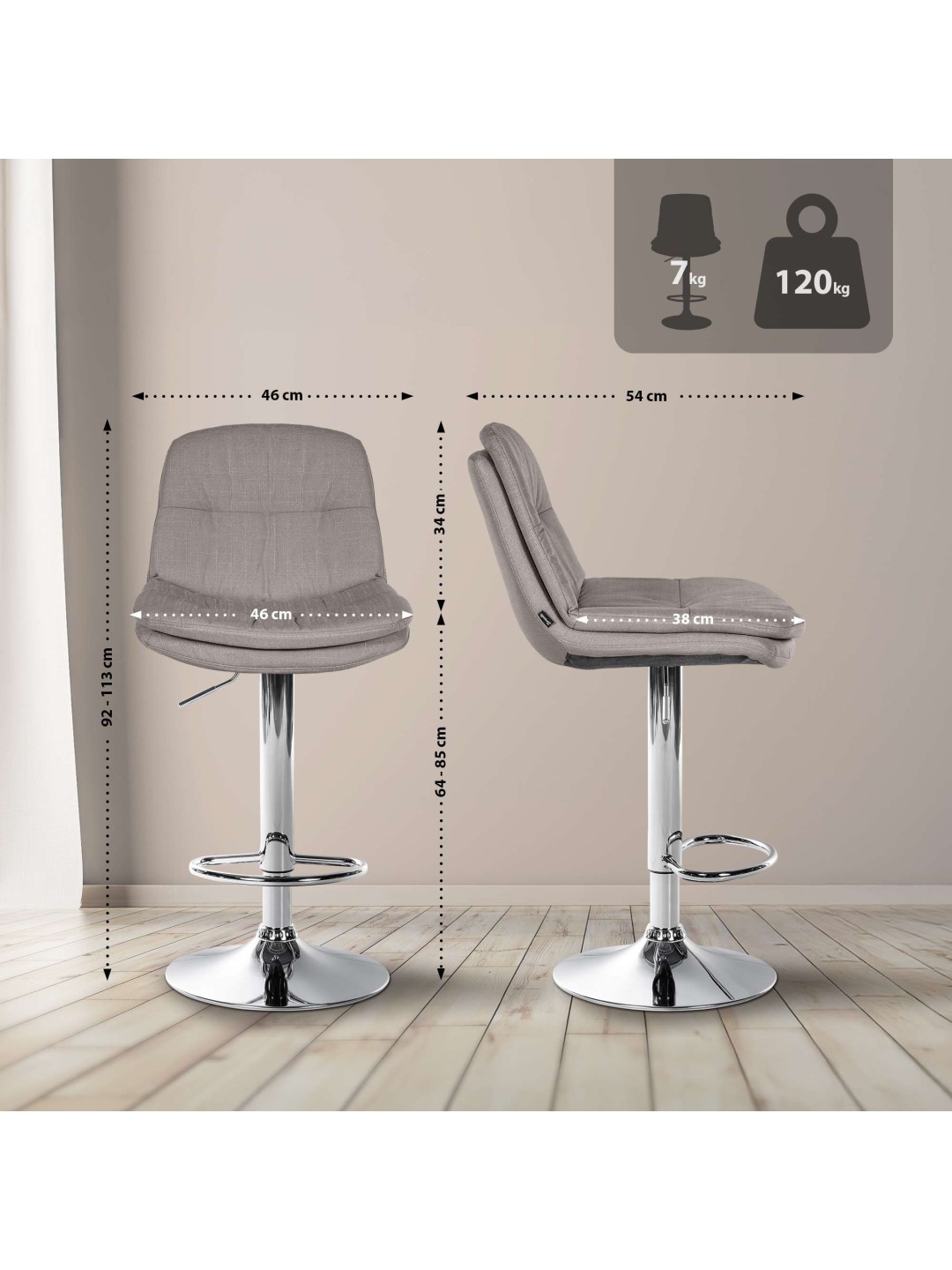 La estructura del taburete y la moderna funda le dan al taburete una apariencia elegante. El asiento está tapizado con tela duradera y de alta calidad. La estructura de metal es ajustable en altura y la función de rotación de 360 grados garantiza una gran libertad de movimiento.