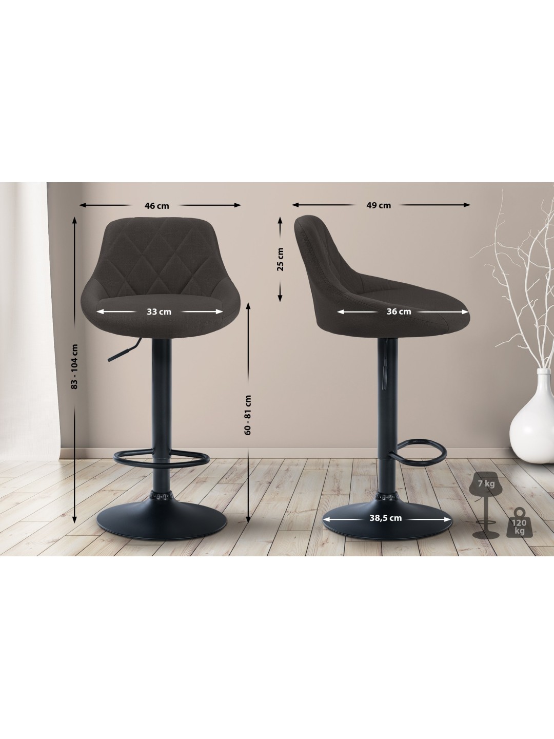 Este taburete convence por su diseño elegante. El asiento está tapizado en tela y tiene laboriosas costuras decorativas. Utilizando el elevador de gas, este modelo se puede ajustar infinitamente a la altura deseada, lo que lo hace ideal para cualquier altura de mostrador. El reposapiés, que garantiza un muy buen confort al sentarse, se puede ajustar en sincronía con la altura del asiento. El asiento se puede girar 360° con el reposapiés. La estructura está hecha de metal, hay protectores de piso debajo de la base de trompeta que evitan que el piso se raye.