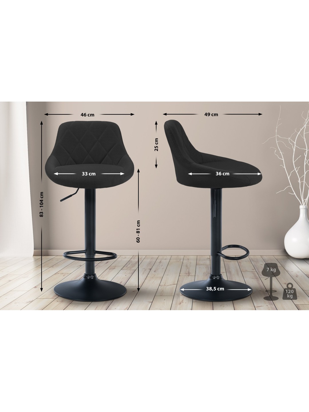 Este taburete convence por su diseño elegante. El asiento está tapizado en tela y tiene laboriosas costuras decorativas. Utilizando el elevador de gas, este modelo se puede ajustar infinitamente a la altura deseada, lo que lo hace ideal para cualquier altura de mostrador. El reposapiés, que garantiza un muy buen confort al sentarse, se puede ajustar en sincronía con la altura del asiento. El asiento se puede girar 360° con el reposapiés. La estructura está hecha de metal, hay protectores de piso debajo de la base de trompeta que evitan que el piso se raye.