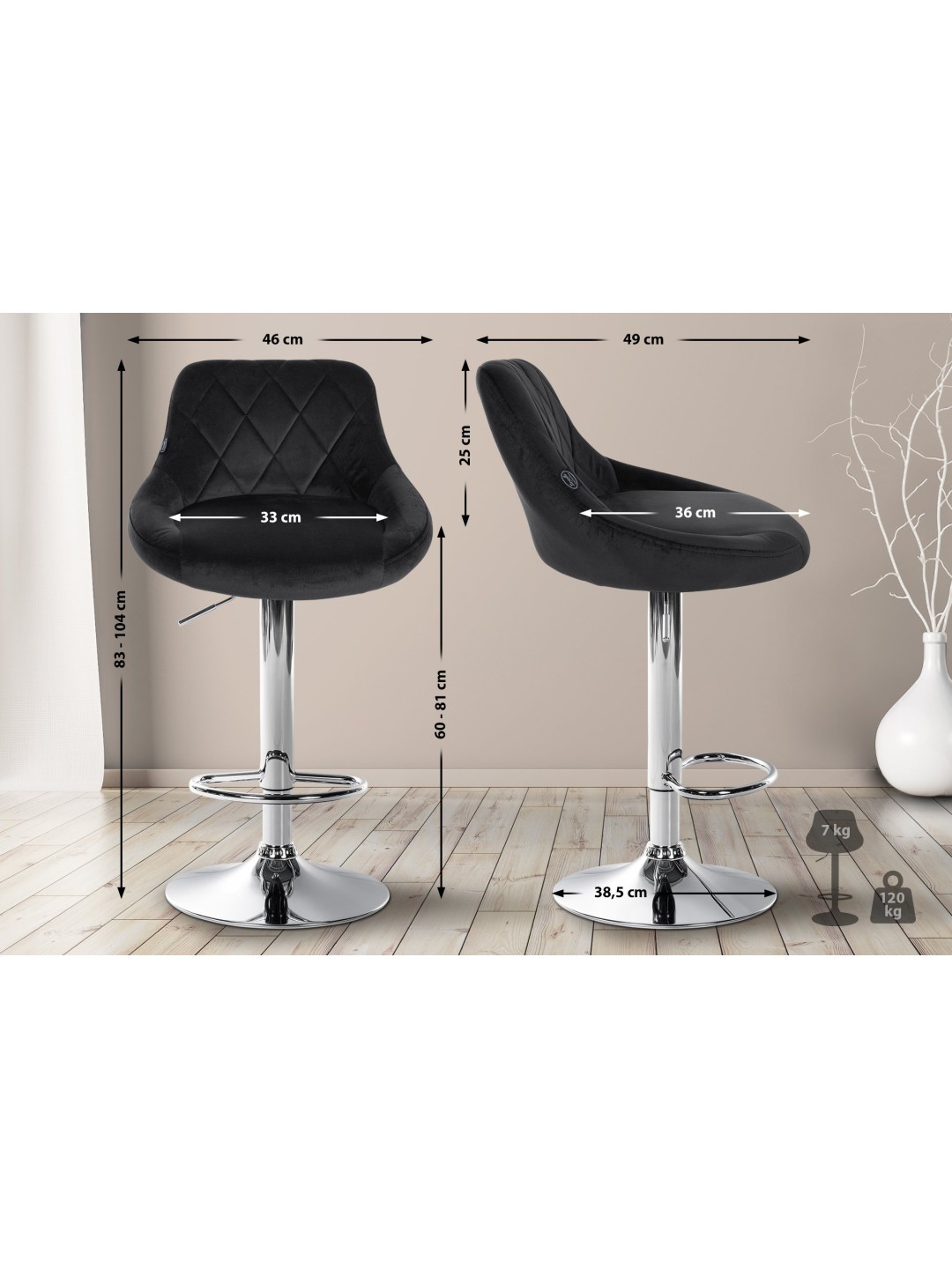 Este taburete impresiona por su diseño elegante. El asiento está tapizado con tela de terciopelo y tiene laboriosas costuras decorativas. Utilizando el elevador de gas, este modelo se puede ajustar infinitamente a la altura deseada, lo que lo hace ideal para cualquier altura de mostrador. El reposapiés, que garantiza un excelente confort al sentarse, se puede ajustar en sincronía con la altura del asiento. El asiento se puede girar 360° con el reposapiés. La estructura está hecha de metal, hay protectores de piso debajo de la base de trompeta que evitan que el piso se raye.