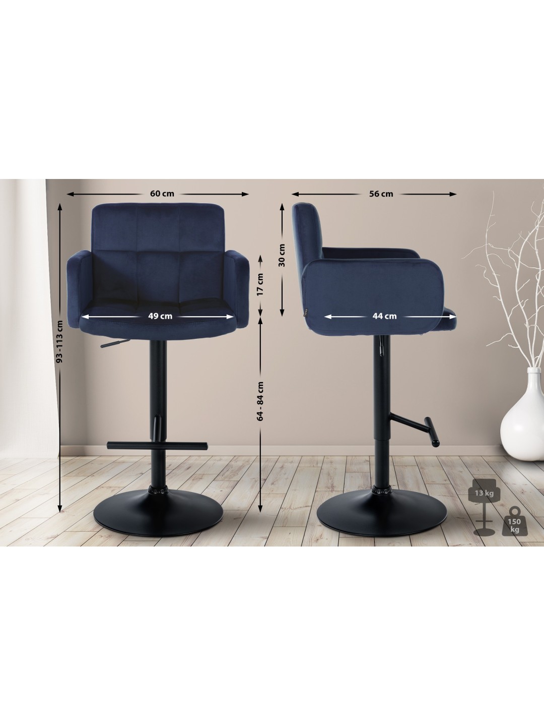 El taburete de bar de diseño Los Angeles es un taburete de bar cómodo y sólido para el uso diario. Los reposabrazos y el respaldo altos permiten sentarse cómodamente, incluso durante largos periodos de tiempo. Además, el asiento está tapizado en terciopelo y tiene un cómodo acolchado.