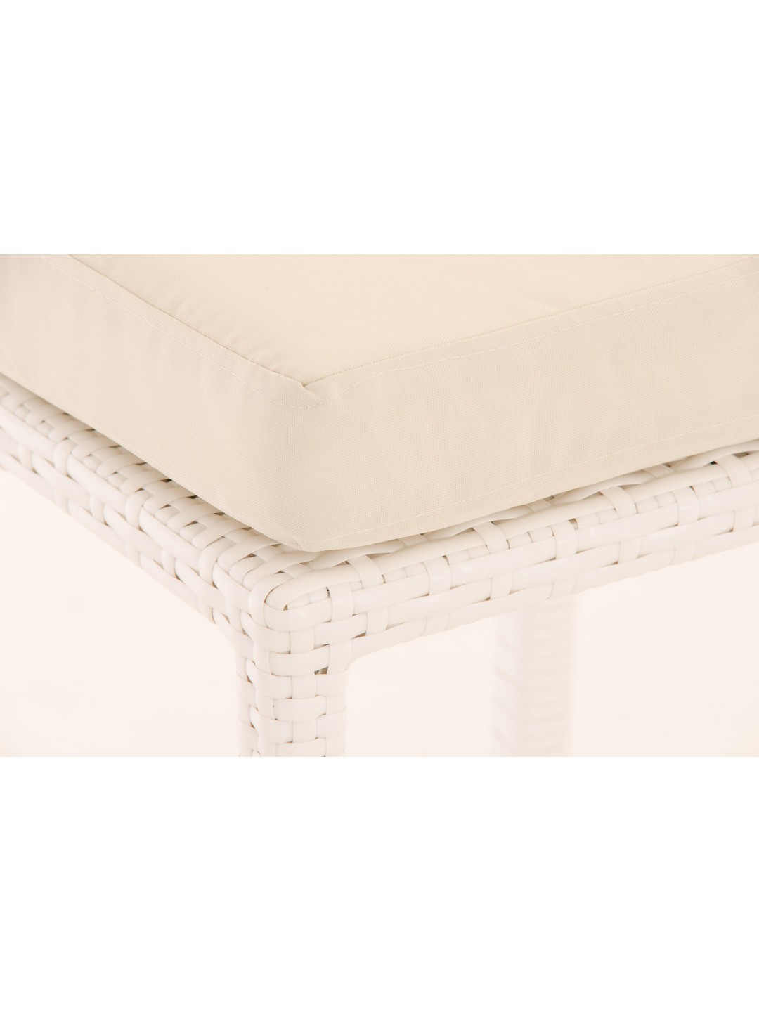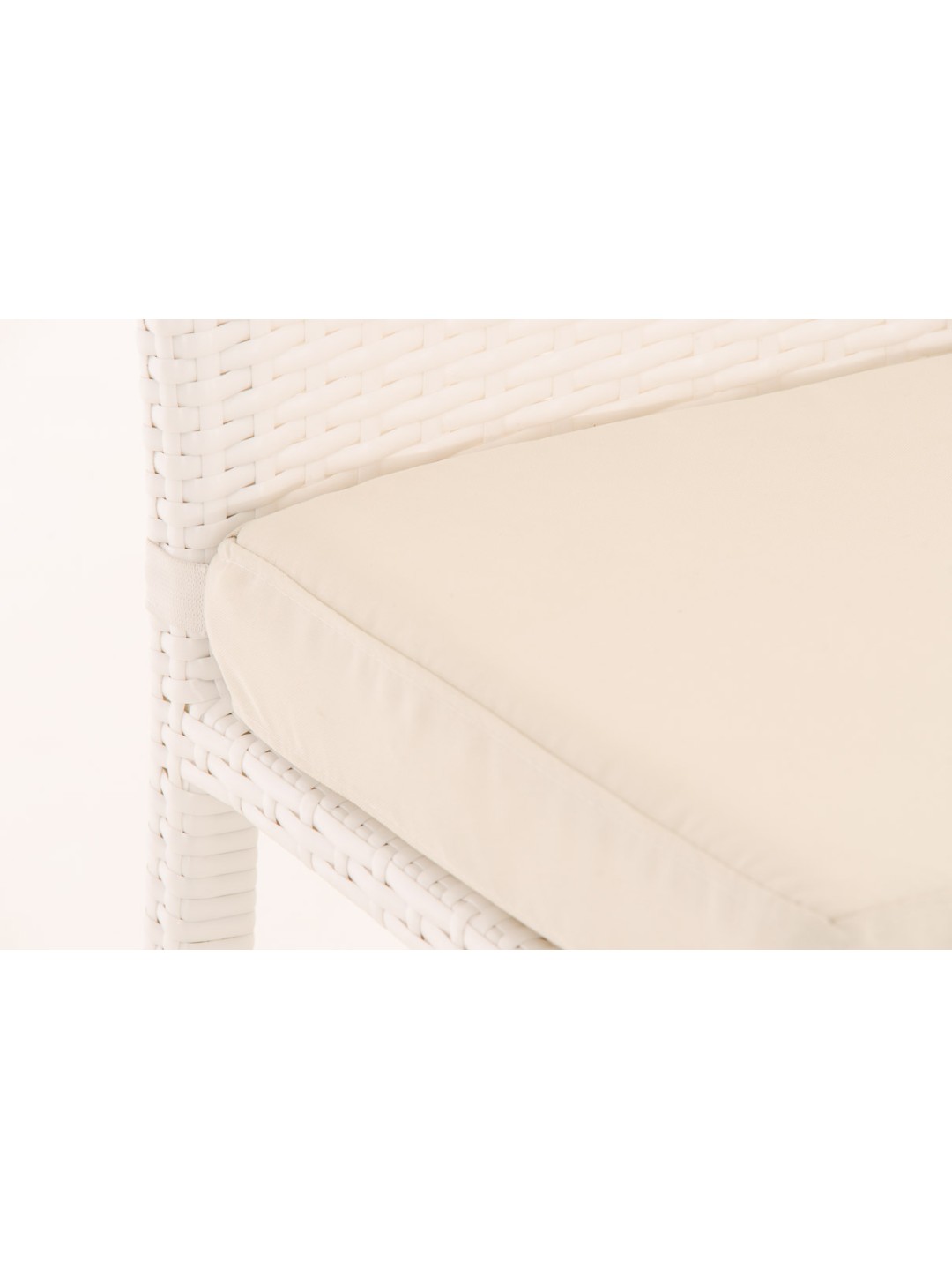 El polirratán, un material resistente a los rayos UV y especialmente adecuado para exteriores, tiene el mismo aspecto que el ratán convencional, pero es mucho más robusto. Las fibras de polirratán de alta calidad son impermeables, fáciles de cuidar y resistentes a los rayos UV, por lo que conservan su intensidad de color incluso después de un uso frecuente y prolongado. Este color elegante, en combinación con una estructura ligera, proporciona un aspecto absolutamente natural a este grupo de asientos. El cómodo cojín del asiento tiene una funda de 100% poliéster. Es repelente al agua y a la suciedad y dura mucho tiempo debido a su alta durabilidad. La estructura o base del juego está hecha de aluminio resistente con recubrimiento en polvo, lo que garantiza su estabilidad y su ausencia permanente de oxidación.