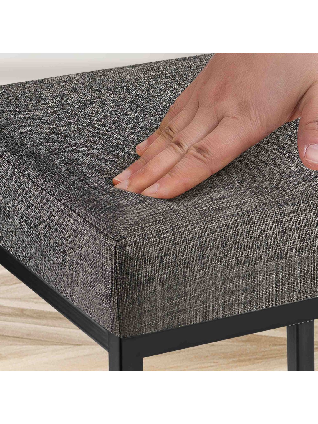El asiento cuadrado de la silla de mostrador es cómodo incluso sin reposabrazos ni respaldo. De ello se encarga el tapizado, que tiene una funda de tela duradera y fácil de cuidar.