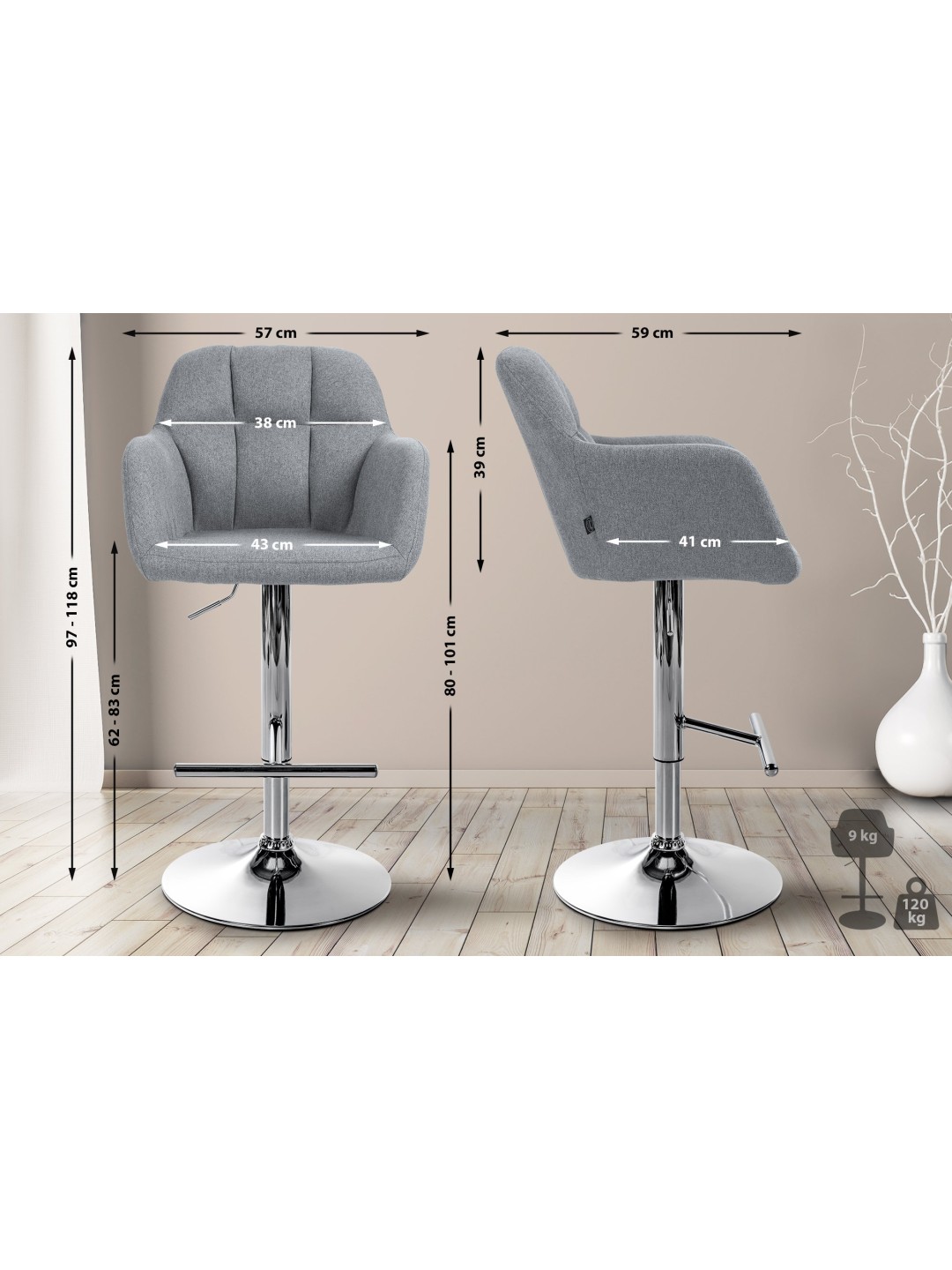 El taburete de bar Natoma tela se caracteriza por su diseño funcional y su comodidad de asiento. El ajuste de altura de 97 a 118 cm, así como un ancho de 57 cm y una profundidad de 59 cm permiten adaptarlo a una amplia gama de alturas de mostrador. El asiento y el respaldo de 43 x 41 cm están diseñados para brindar apoyo y comodidad. Los reposabrazos y el reposapiés en la base de la trompeta aumentan la funcionalidad, mientras que el protector del suelo evita daños a la superficie. Con un peso de 9 kg y una capacidad de carga de hasta 120 kg, el taburete de bar Natoma es un asiento robusto. La función de rotación de 360° también promueve la movilidad y la flexibilidad.