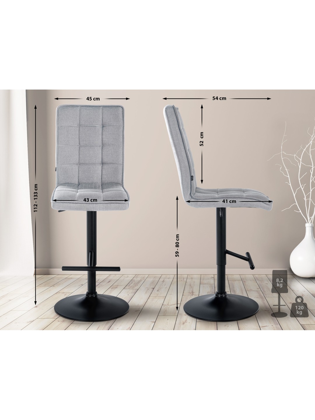 Este modelo tiene una base de trompeta resistente y un reposapiés para sentarse de forma segura y cómoda. La altura del asiento se puede ajustar individualmente mediante una palanca situada en la parte inferior derecha del asiento. Su diseño moderno hace que encaje perfectamente en cualquier salón, comedor o cocina.