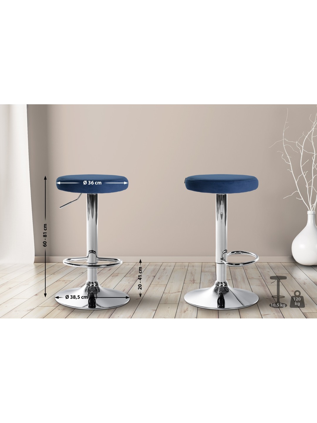 La cubierta de terciopelo del asiento acolchado redondo está disponible en ocho atractivos colores, lo que le permite elegir el estilo perfecto para su hogar. La robusta estructura de metal está disponible en tres atractivos modelos: blanco mate, negro mate o con aspecto cromado. Un reposapiés integrado proporciona comodidad adicional.