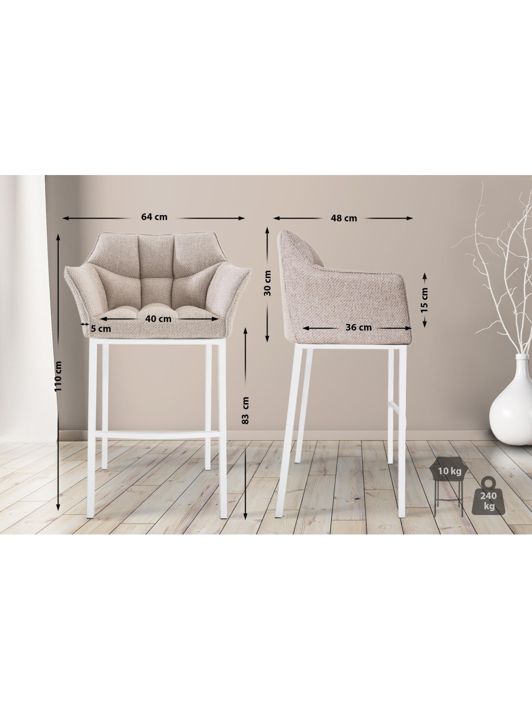 Taburete de bar tela Damaso con estructura de 4 pies, marfil