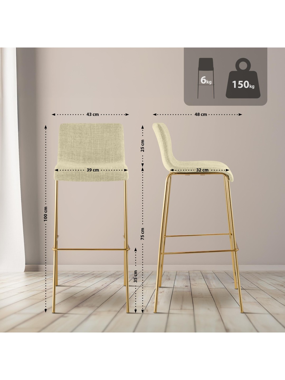 Taburete de bar Tela Hoover 4 pies dorado, crema