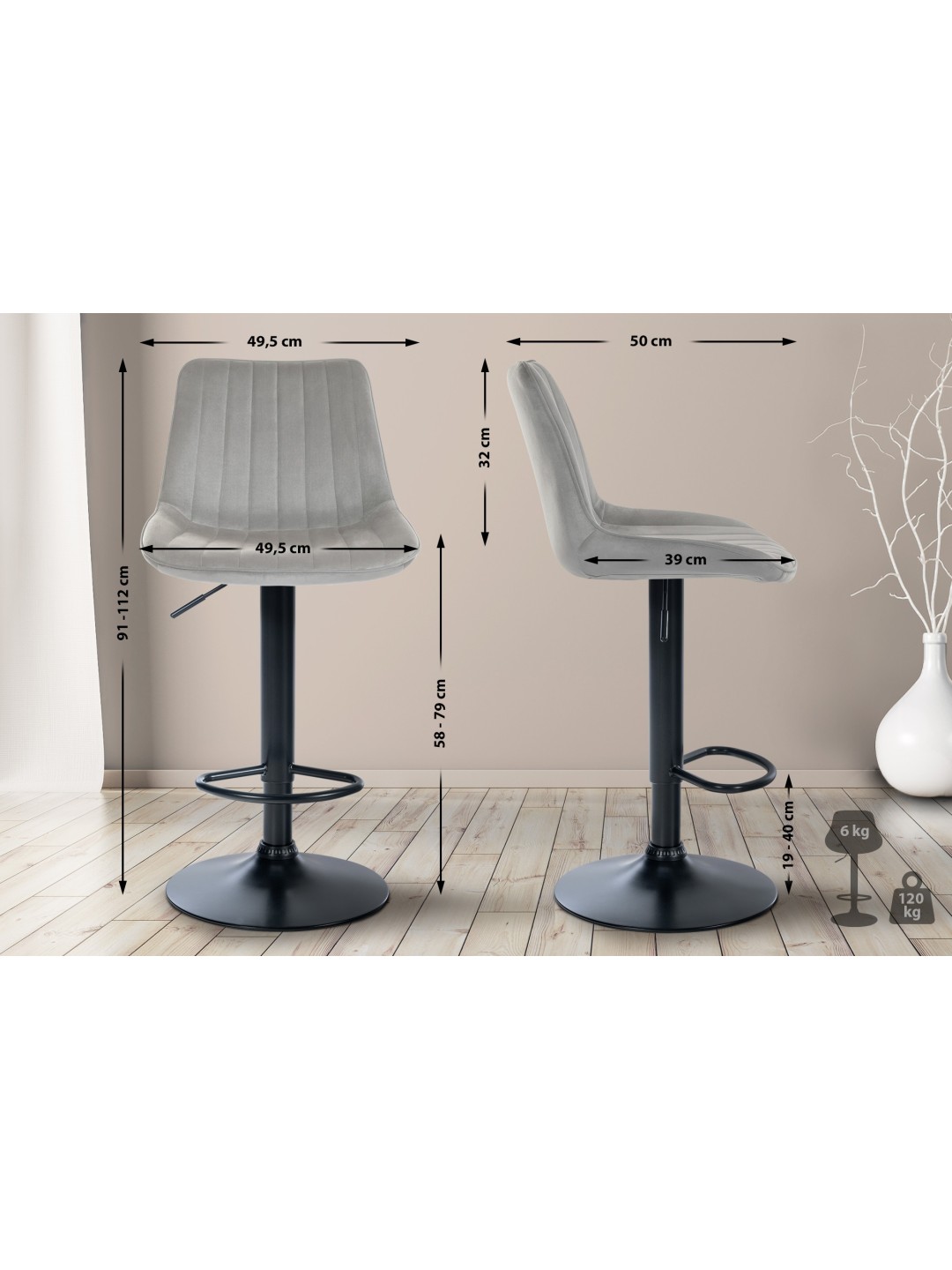 Taburete de bar Toni terciopelo, gris
