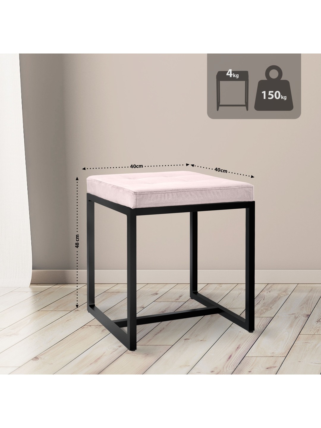 La estructura del taburete de hierro puede soportar hasta 150 kilogramos y ofrece un alto nivel de estabilidad gracias a sus cuatro robustas patas. El tamaño compacto del taburete permite una colocación flexible en casi cualquier habitación y es particularmente ventajoso para salas de estar pequeñas y espacios estrechos.