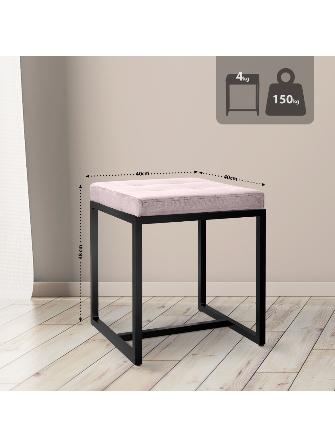 La estructura del taburete de hierro puede soportar hasta 150 kilogramos y ofrece un alto nivel de estabilidad gracias a sus cuatro robustas patas. El tamaño compacto del taburete permite una colocación flexible en casi cualquier habitación y es particularmente ventajoso para salas de estar pequeñas y espacios estrechos.